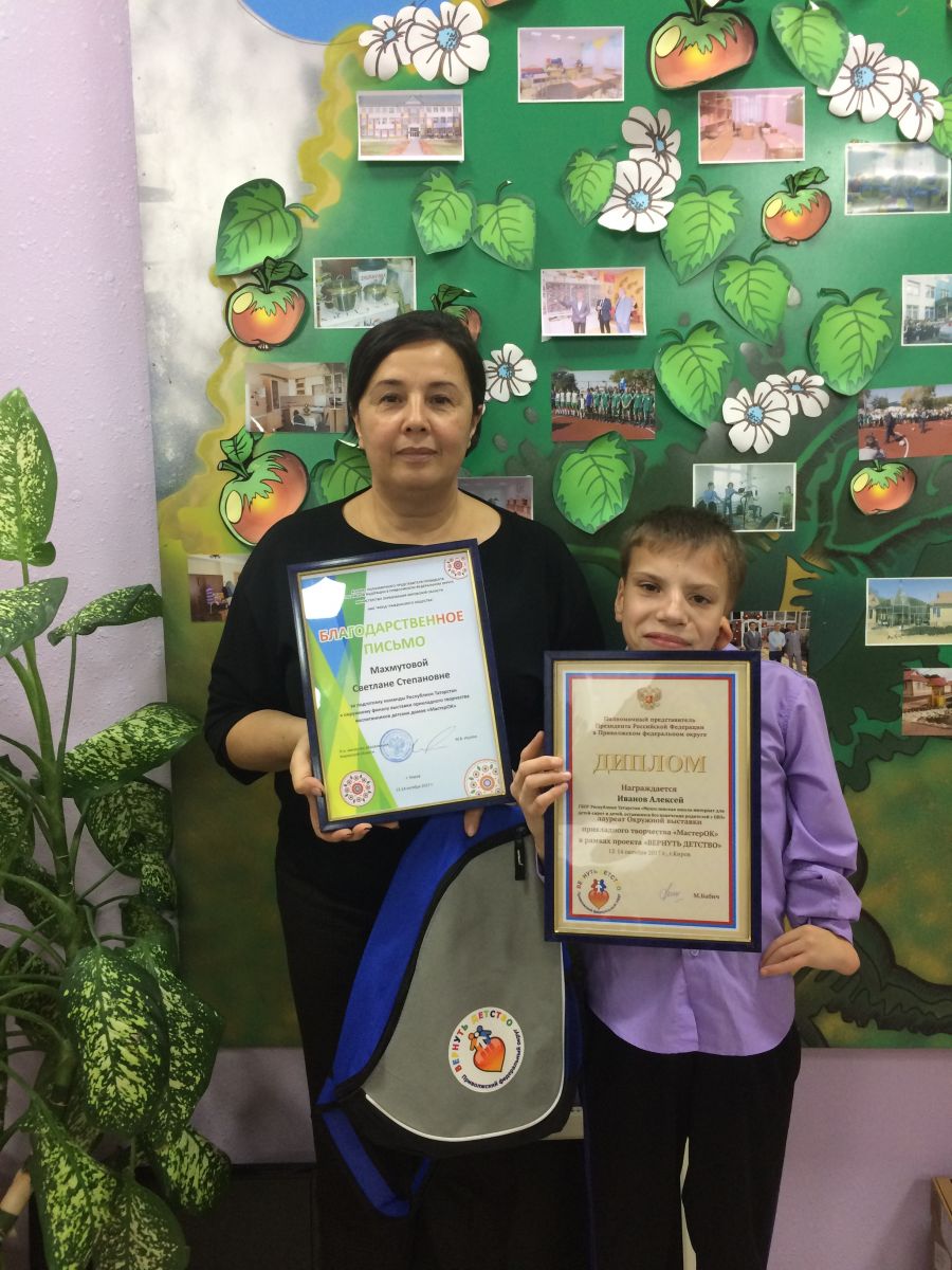 Иванов Алексей Сергеевич, 10.04.2005 года рождения, учится в 6В классе Мензелинской школы-интерната для детей-сирот и детей, оставшихся без попечения родителей, с ограниченными возможностями здоровья. Алексей творческий человек, активно участвует в школьной жизни, проявляет интерес к художественной самодеятельности, играет на ложках, любит заниматься искусством, рисует. Уже на протяжении нескольких лет занимается в кружке декоративно-прикладного искусства «Очумелые ручки» и на сегодняшний день владеет различными техниками. Свои работы представлял на многих конкурсах и становился неоднократно победителем. Для него искусство – это состояние души, возможность самовыражаться, творить, создавать. Девизом по жизни: «Мне всё интересно». Особенно ему нравится заниматься витражным искусством. На окружную выставку «МастерОК» среди воспитанников детских домов Приволжского федерального округа в рамках общественно значимого проекта поддержки детских домов и социальной адаптации детей, оставшихся без попечения родителей, «ВЕРНУТЬ ДЕТСТВО», реализуемого в Приволжском федеральном округе под патронатом полномочного представителя Президента РФ в ПФО представил работу «Маковый цвет» (витраж), которая была определена лучшим по итогам областных отборочных конкурсов, руководитель: педагог-дефектолог Махмутова Светлана Степановна. Так же данная работа была оценена на финальной окружной выставке и воспитанник Мензелинской школы-интерната был награжден ценным призом.