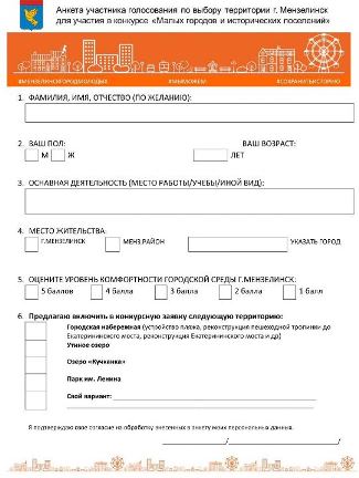 Уважаемые жители г.Мензелинска! Российское правительство для сохранения и умножения исторических мест запускает конкурс «Малых городов и исторических поселений». У Мензелинска есть все возможности участвовать и получить грант для развития общественных пространств. С этой целью власти города запускают анкетирование населения. Просим вас ответить на вопросы анкеты. Анкеты будут розданы. Заполненную анкету можно принести в исполком города.