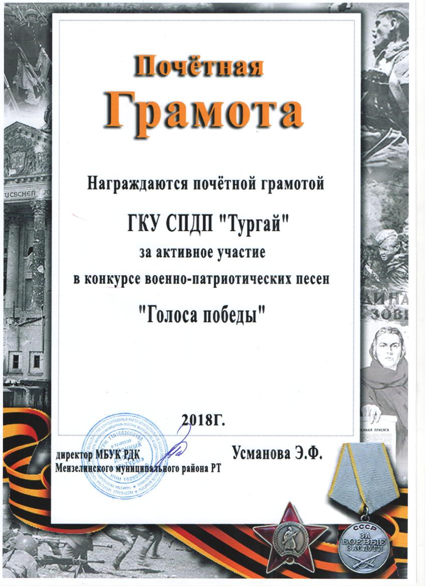 В середине февраля команда воспитанников социального приюта «Тургай» в Мензелинском муниципальном районе приняла участие в конкурсе военно-патриотических песен «Голоса Победы», организованном Староматвеевским сельским домом культуры. В конкурсе соревновались также команды воспитанников детского сада «Омет» и учащихся 6 класса МБОУ «Матвеевская ООШ». Дети рассказывали стихотворения, пели песни на военную тематику и танцевали.
