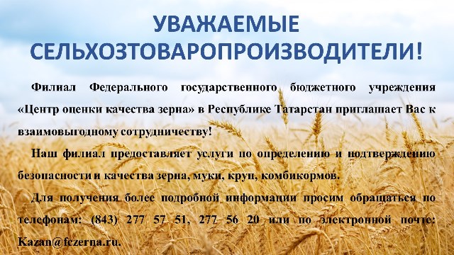 Филиал ФГБУ «Центр оценки качества зерна» в РТ приглашает к сотрудничеству