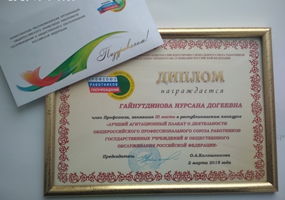 В марте в профсоюзе госучреждений проведен республиканский конкурс на лучший агитационный плакат. Первый этап конкурса прошел на районном уровне, где были отобраны три лучшие работы. На втором, республиканском этапе плакат МБУ ДО «ДЮСШ Юность», председатель Нурсина Гайнутдинова, занял третье место. Победителя наградили Диплом и ценным подарком. Далее агитационный плакат победителя направится в Центральный комитет Профсоюза для участия во II этапе Общероссийского конкурса. Все остальные участники Конкурса были отмечены Благодарностями Татарстанского республиканского комитета Профсоюза.