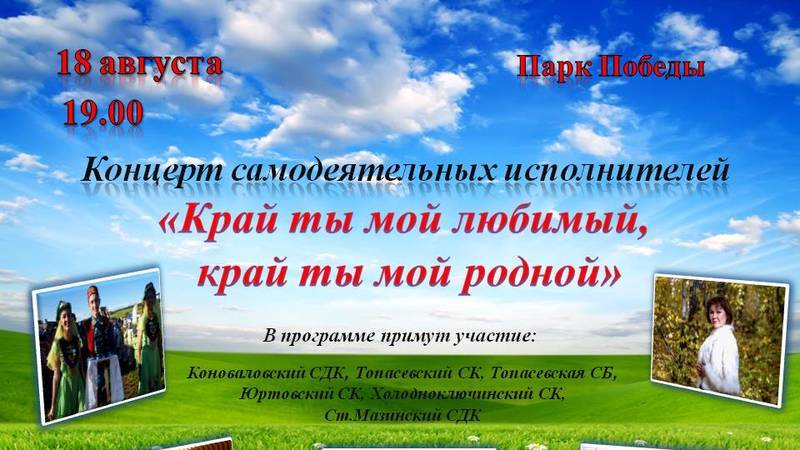 Приглашаем вас на концерт самодеятельных исполнителей «Край ты мой любимый, край ты мой родной», который пройдет 18 августа в 19.00 в парке Победы.