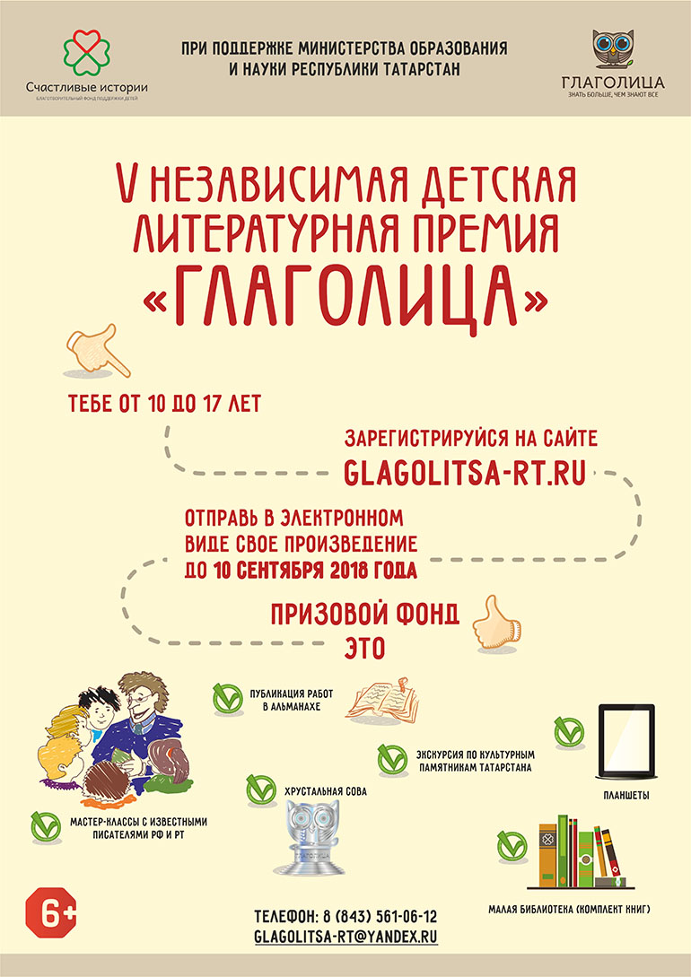 Благотворительный фонд «Счастливые истории» запустил ежегодный конкурсный сезон Независимой детской литературной премии «Глаголица» среди юных авторов из России, стран ближнего и дальнего зарубежья, пишущих на русском и татарском языках.
