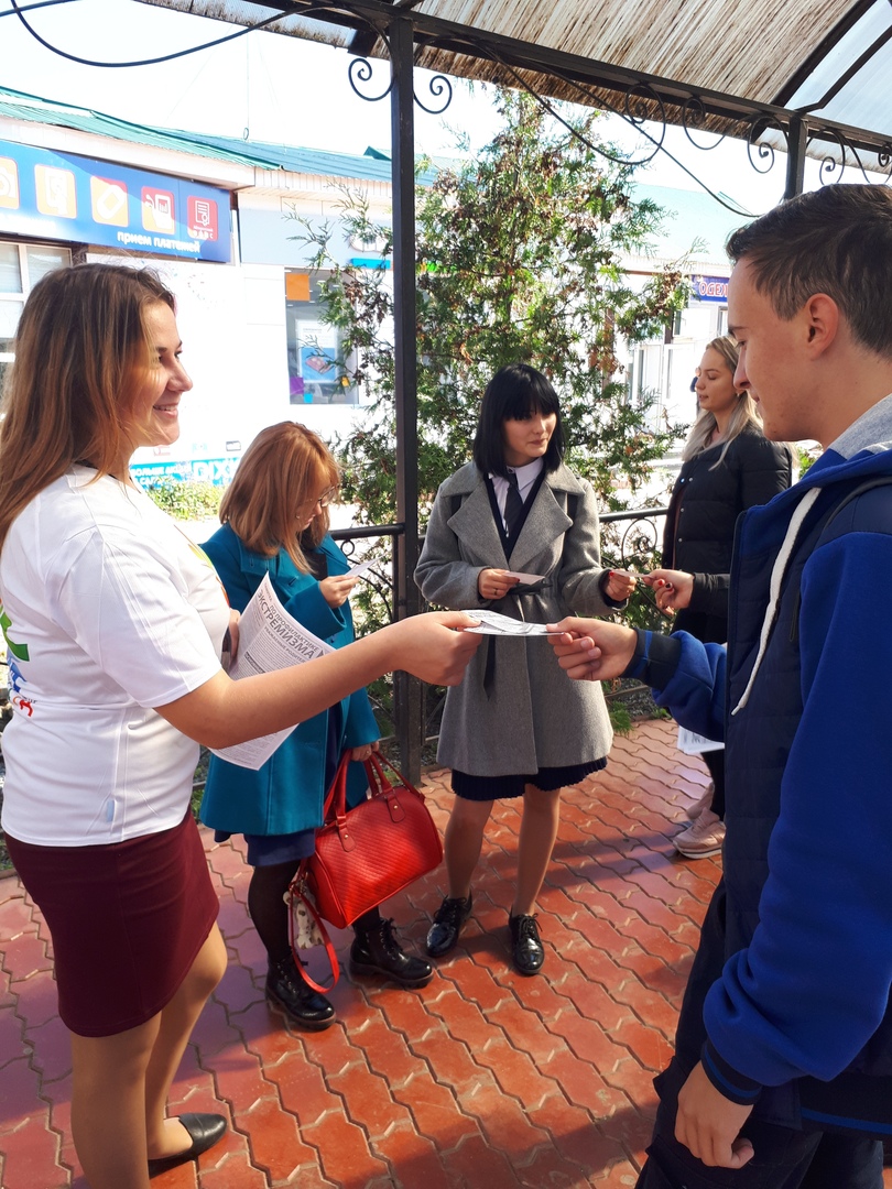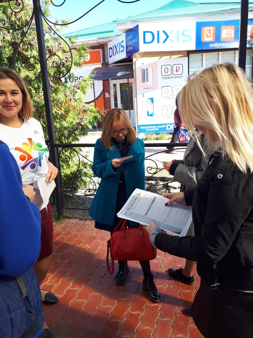 11 сентября сотрудники многопрофильного молодежного центра «Веста» провели акцию «Скажи нет терроризму и экстремизму». Распространение памяток и методических инструкций по противодействию терроризма и экстремизма. Акция проходила в центре города в течение дня.