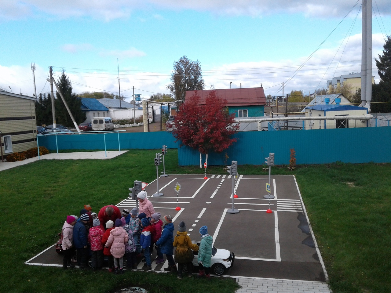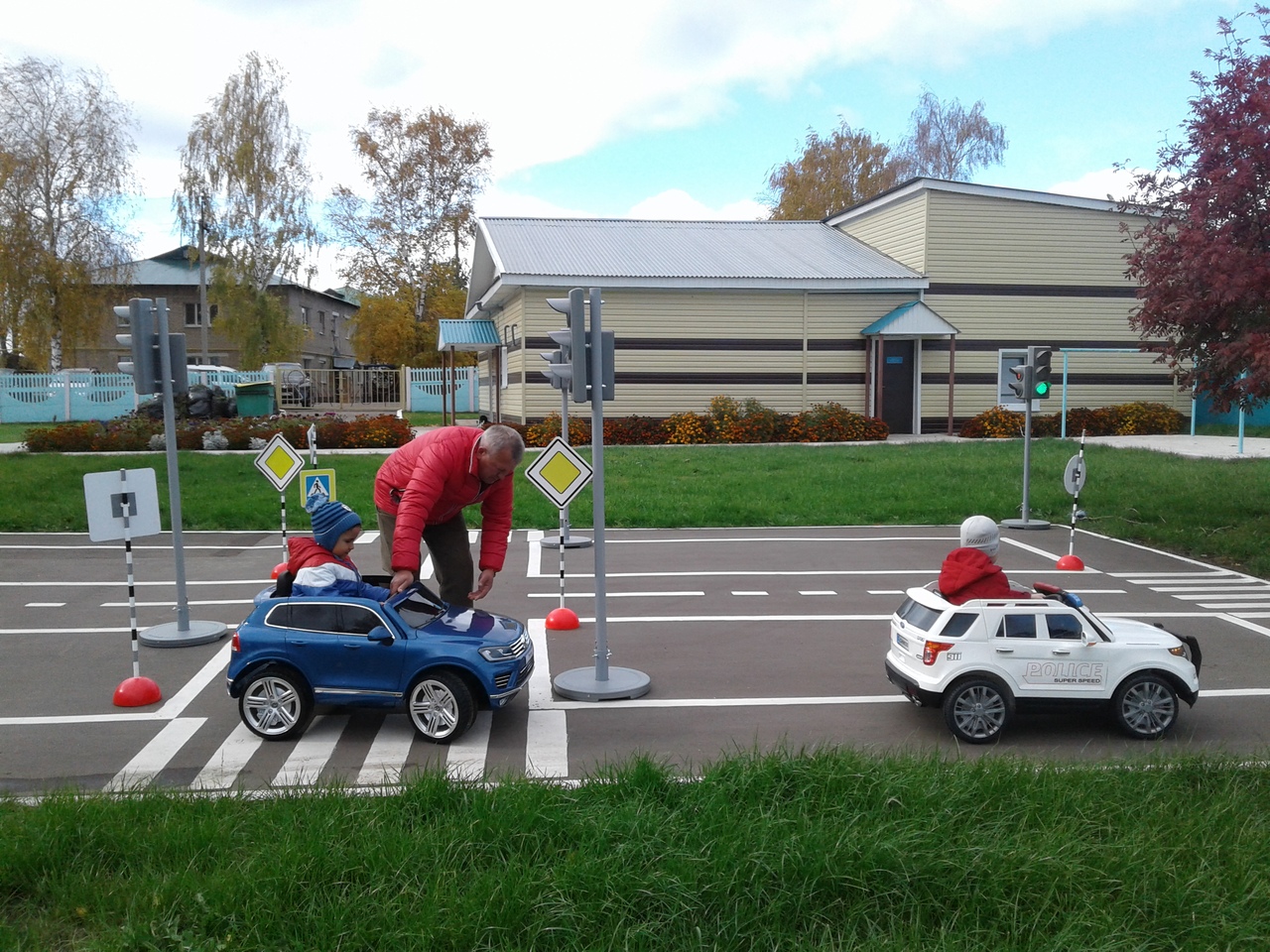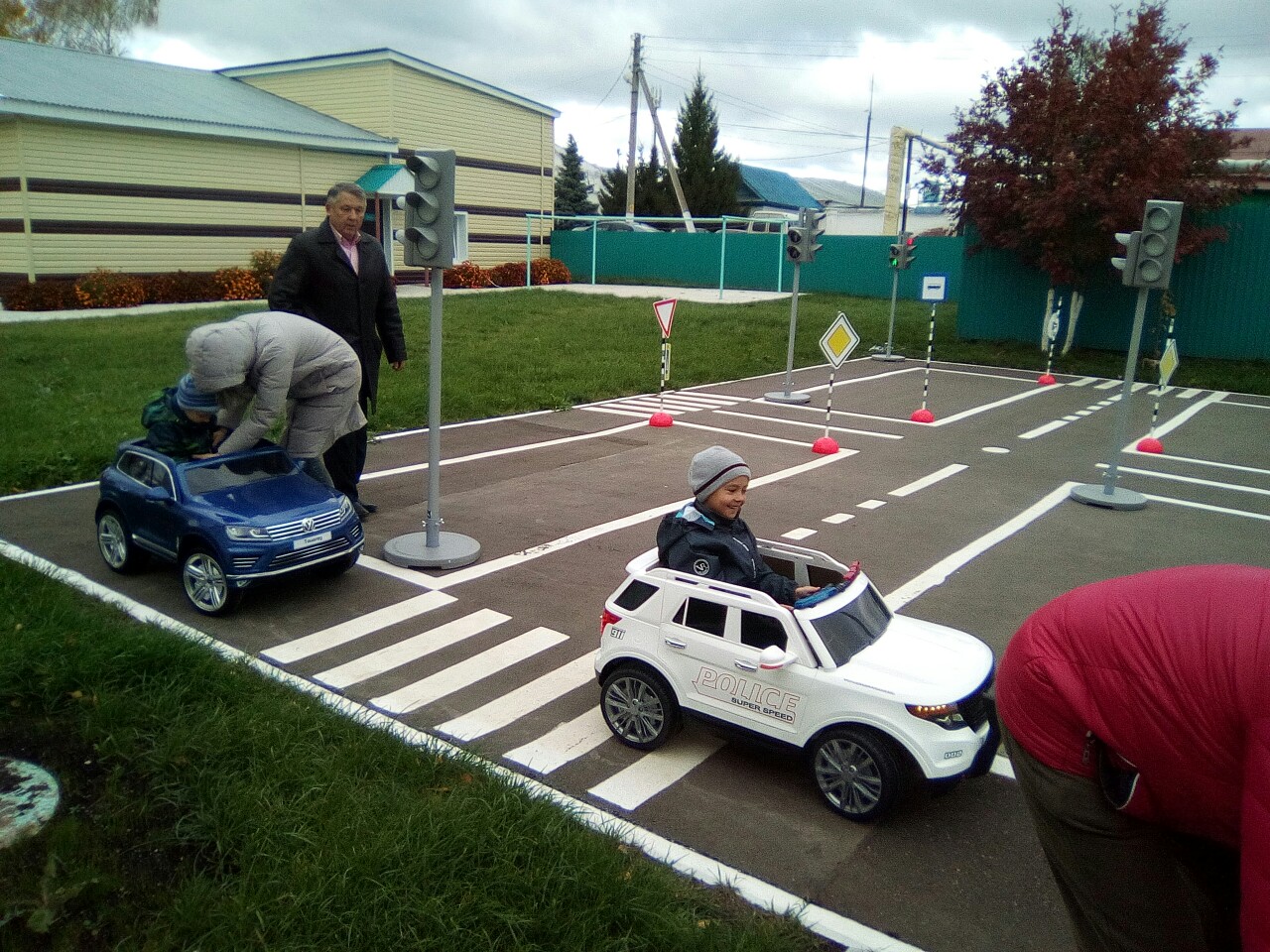 На оборудованной площадке по ПДД, детей обучали первоначальным элементам управления электромобилями.