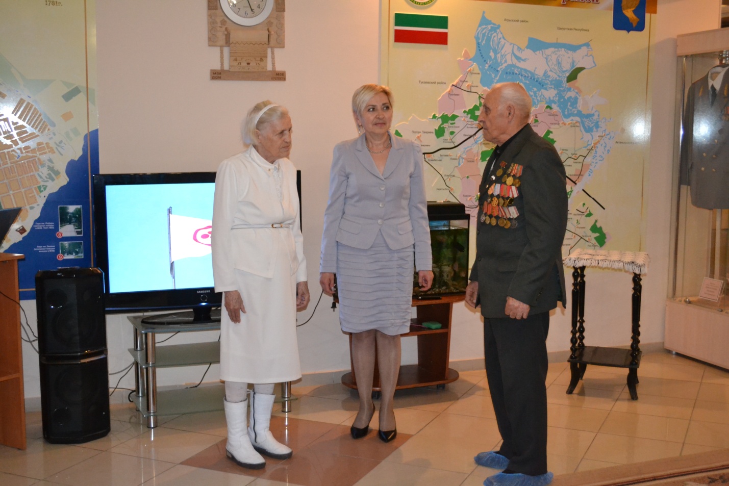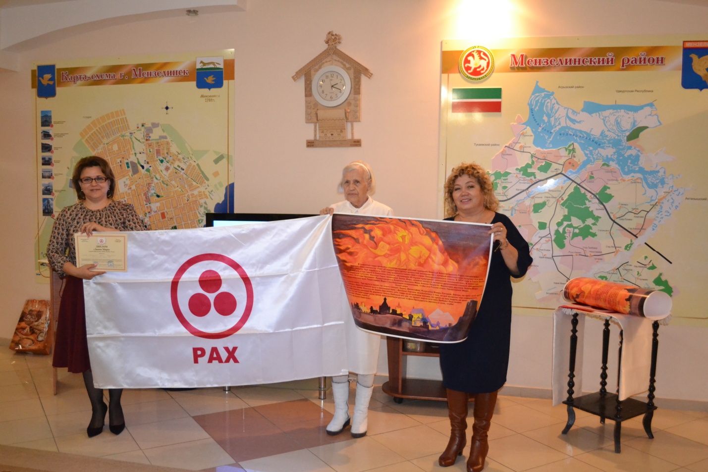 На вечное хранение знамя из рук посланника Макаренко приняли заведующая музея Мусы Джалиля - Алсу Григорьева и Лариса Карамова – директор краеведческого музея, последняя от имени присутствующих поблагодарила Тамару Сергеевну.