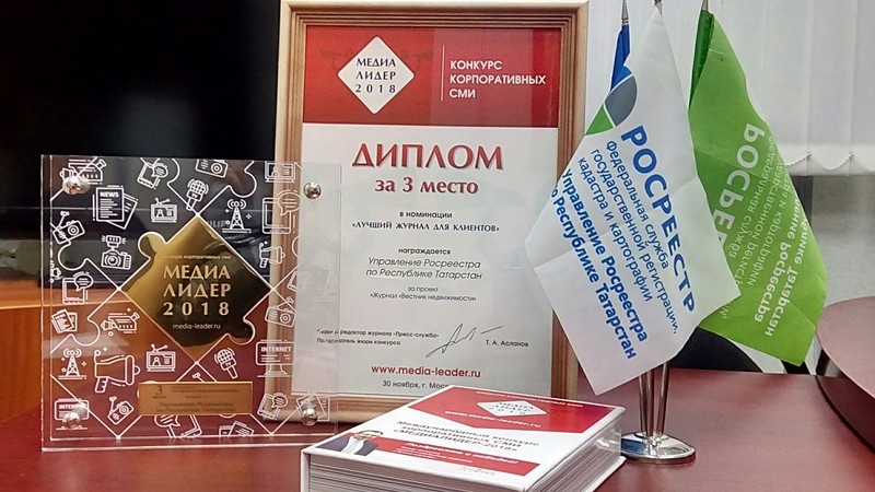 Управление Росреестра по Республике Татарстан вошло в число победителей меңдународного конкурса корпоративных СМИ “Медиалидер-2018” заняв III место в номинации «Лучший журнал для клиентов» за журнал «Вестник недвижимости», выпускаемый ведомством с 2009 года.