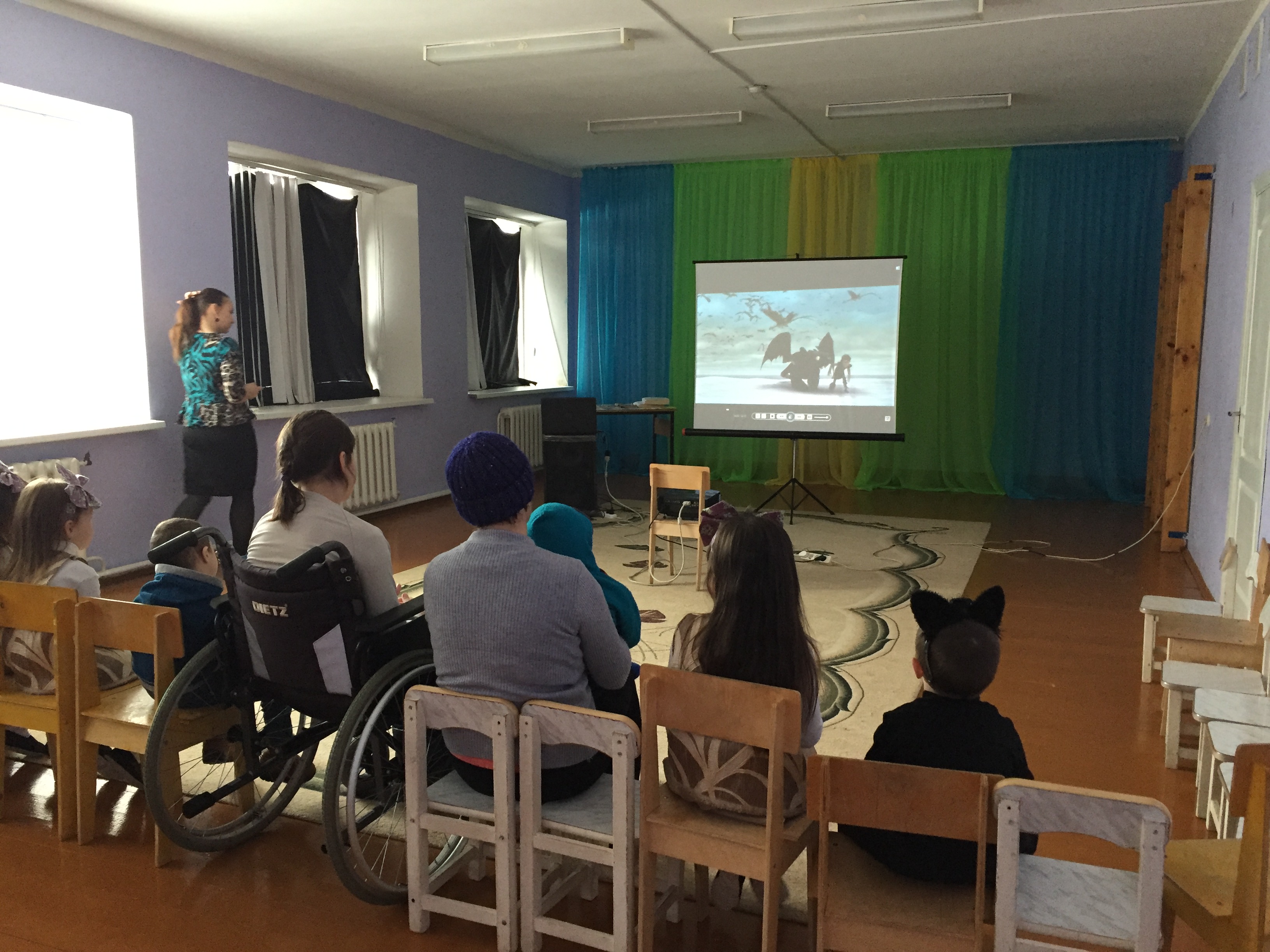 Для семей была подготовлена обширная и увлекательная программа. Ведущий специалист Митюшкина Е.В. показала широкоэкранный мультфильм «Как приручить дракона 2». Детский мультфильм полон не просто нравоучениями о добре и зле. Главные герои картины инвалиды, но стойкости духа, смелости и героизма им не занимать. Дети смеялись, радовались, получили огромное удовольствие.