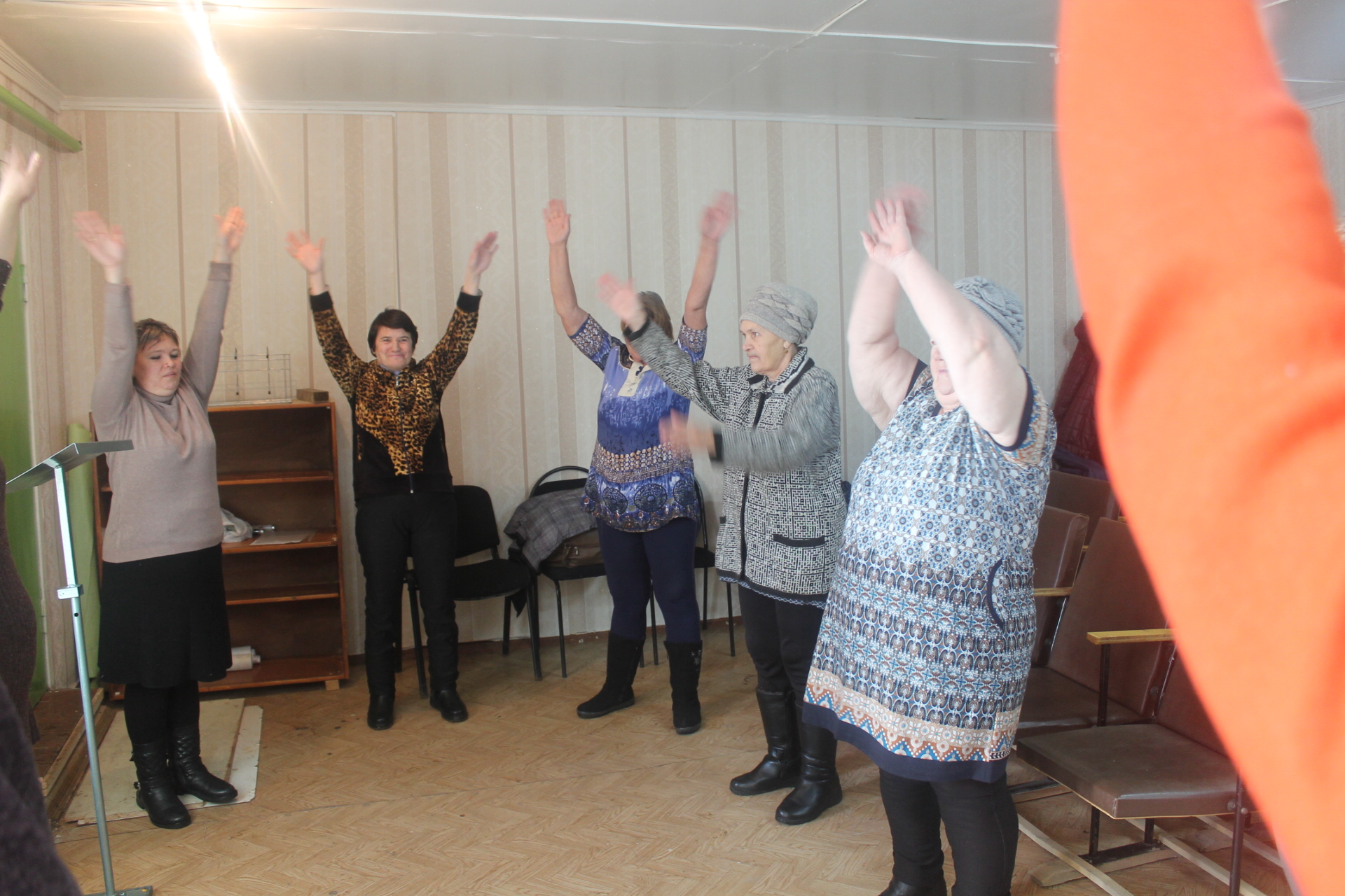 Для снятия усталости и напряжения, внесении эмоционального заряда медицинский работник с подопечными провела физкультминутку. Для поднятия настроения социальные работники провели шуточные эстафеты.
