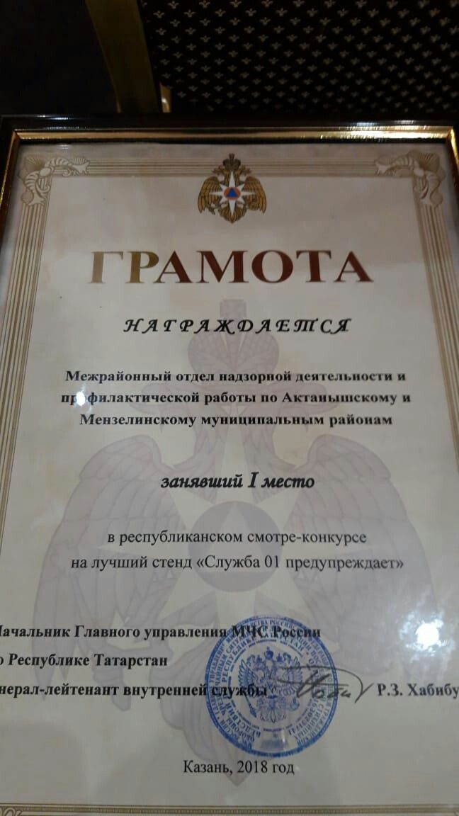 Межрайонный отдел надзорной деятельности и профилактической работы по Актанышскому и Мензелинскому муниципальным районам Главного управления МЧС России по Республике Татарстан (начальник - Альберт Тимерханов) занял 1 место в республиканском смотр-конкурсе на лучший стенд "Служба 01 представляет".