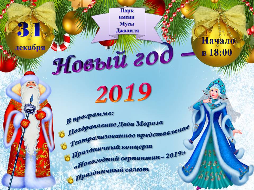 Встретить Новый год жителей и гостей города приглашаем 31 декабря в 18 часов в парк имени М.Джалиля, где можно будет посмотреть новогоднее представление с Дедом Морозом и Снегурочкой.