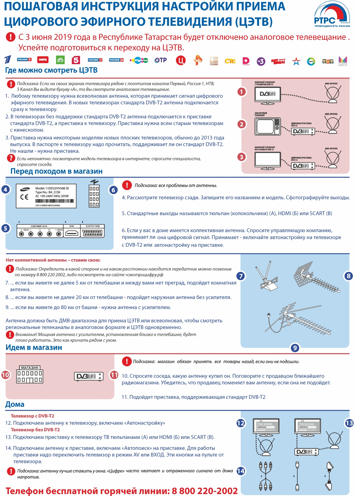 3 июня 2019 года в Республике Татарстан предстоит полномасштабный переход на цифровое телевещание, в рамках которого будет отключено аналоговое эфирное телевещание. Если на своих экранах телевизора рядом с логотипом каналов Первый, Россия 1, НТВ, 5 Канал Вы видите букву «А», то Вы смотрите аналоговое телевещание. В рамках перехода на цифровое телевещание Вам необходимо сделать следующее: