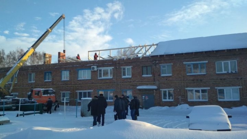 Работники организации-подрядчика (Мензелинская ПМК) были заняты кровельными работами, подрядчику поставлена задача ускорить темп и как можно быстрее завершить монтаж кровли.