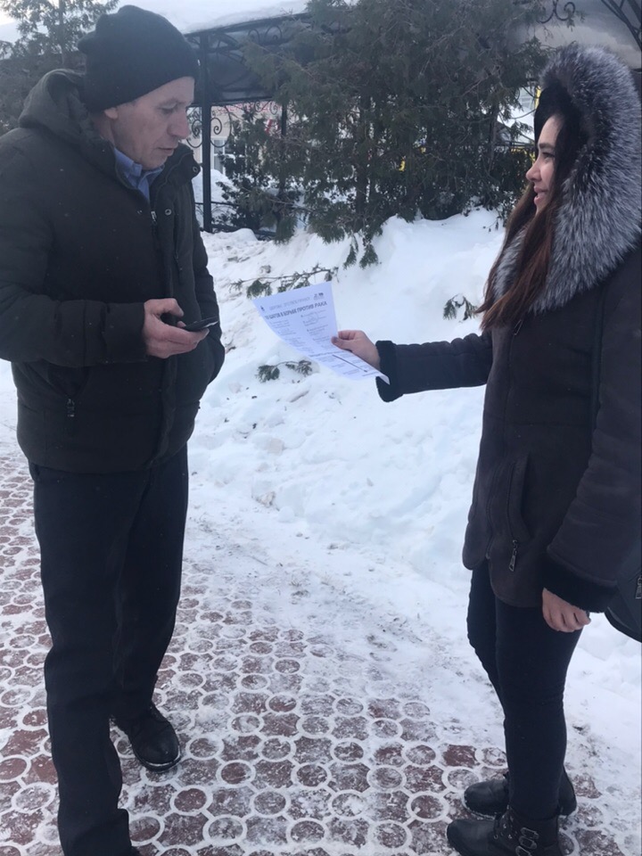 1 февраля сотрудниками молодежного центра «Веста» была проведена акция «Мы сильнее только вместе» в рамках Всемирного дня борьбы с раком. Рак бичует человечество, планомерно внося свой вклад в ограничение темпов роста численности населения. Выступая в губительной роли «чистильщика» человечества, по ходу последних десятилетий смертельная патология не только приобретает распространение, но и «вычищает» все больше молодых трудоспособных, полных планов на будущее людей. Акция прошла в центре города. Сотрудники раздавали листовки «10 шагов в борьбе против рака». В котором были указаны, как мы можем не допустить эту страшную болезнь.