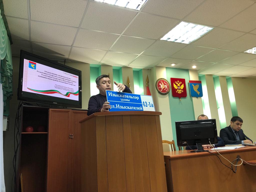С отчетом по доле нормативных правовых актов, опубликованных на официальном портале правовой информации Республики Татарстан и информационных стендах на русском и татарском языках, выступила начальник юридического отдела Совета района Рузина Бадриева.Заместитель начальника отдела строительства, архитектуры и ЖКХ Владимир Петров выступил с отчетом «О доле средств внешней и внутренней визуальной информации, оформленной на двух государственных языках». Он подробно рассказал об оформлении на двух языках внутренней и внешней визуальной информации, о порядке записи адресных табличек зданий, уличных, дорожных указателей. В качестве наглядного примера он продемонстрировал адресный указатель, выполненный по нормативам действующего закона, и ознакомил с правилами установки указателя на зданиях. Прозвучала критика в отношении некоторых организаций района, на зданиях которых адресные таблички либо вообще отсутствуют, либо установлены с ошибками.