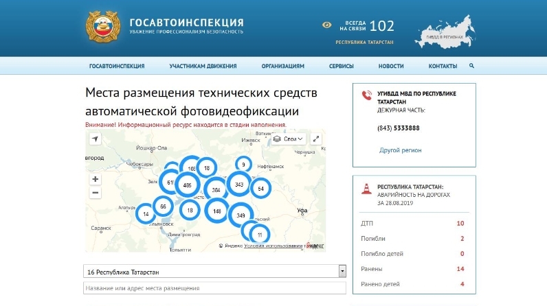 ГИБДД запустил в тестовом режиме новый интерактивный сервис, где собрана информация о местах размещения работающих в автоматическом режиме специальных технических средств, имеющих функции фото- и киносъёмки, видеозаписи для фиксации нарушений ПДД.