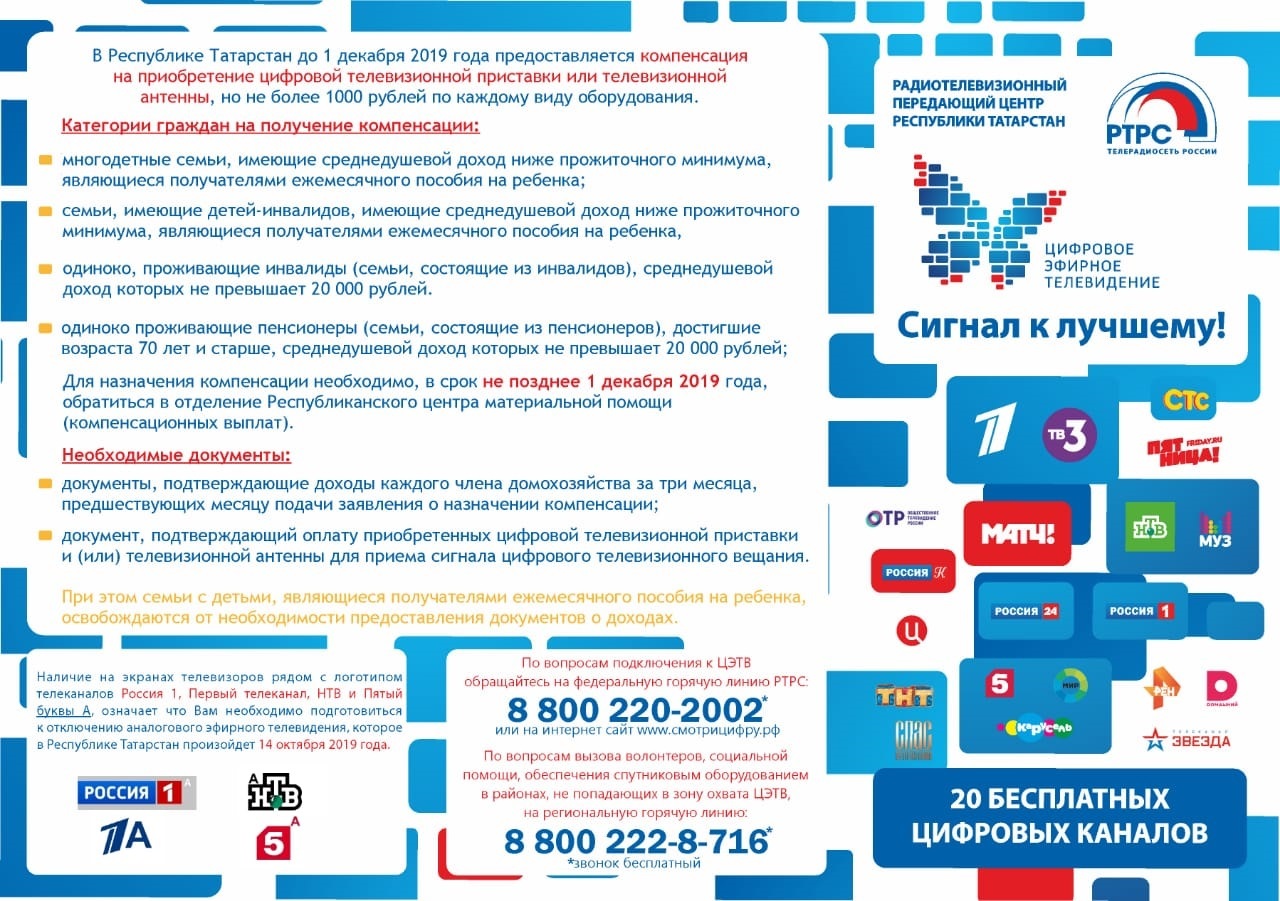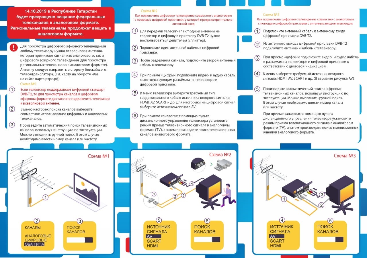 Министерство информатизации и связи Республики Татарстан напоминает, что 14 октября 2019 года в Республике Татарстан предстоит полномасштабный переход на цифровое телевещание, в рамках которого будет отключено аналоговое эфирное телевещание. Если на своих экранах телевизора рядом с логотипом каналов Первый, Россия 1, НТВ, 5 Канал Вы видите букву «А», то Вы смотрите аналоговое телевещание.