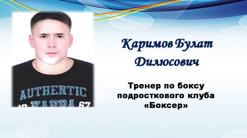 По результатам конкурса первое место занял Каримов Булат Делюсович, тренер – преподаватель по боксу подросткового клуба «Боксер», специалист по работе М(С,Ш) ФООП «Форпост» Мензелинского муниципального района.