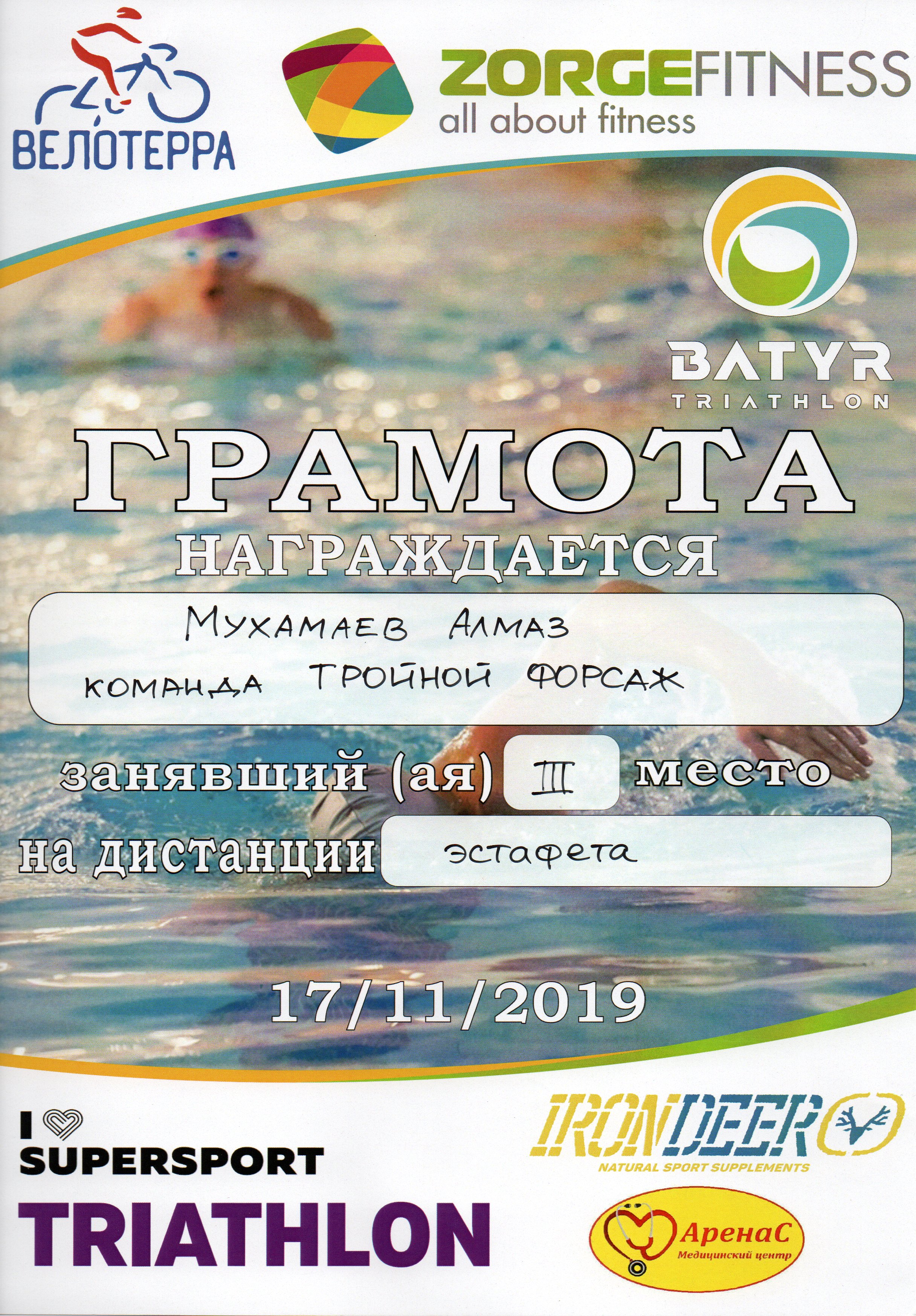 17 ноября 2019 г. в г. Уфа состоялись соревнования по триатлону в помещении, организованные федерацией триатлона Республики Башкортостан. Соревнования проводились на дистанции «суперспринт» в личном зачете и «Спринт» в двух зачетах: личный и эстафета. Дистанция состояла из трех этапов: плавание в бассейне, 750м; велостанок, 20 км; бег на беговой дорожке 5 км. Студент 3Ф группы Мензелинского педагогического колледжа им. М. Джалиля, Мухамаев Алмаз участвовал в третьем этапе. В итоге команда с результатом 1 час 11 минут, завоевала третье командное место в эстафете.
