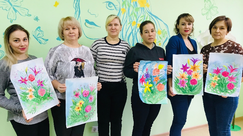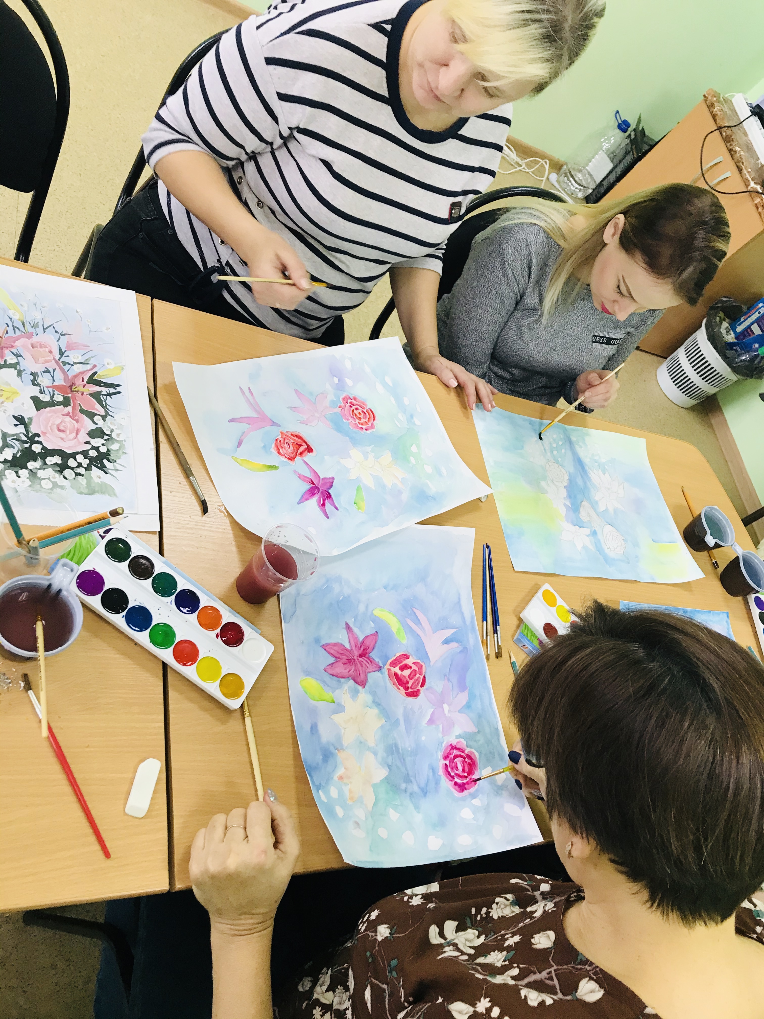 Неделей раньше, там же, был организован мастер – класс по созданию картин в технике рисования акварелью. Художник Светлана познакомила участниц с техникой рисования акварельными красками, научила рисовать картины с цветами, ведь цветы – это постоянный источник вдохновения. Каждый смог выбрать себе картинку по душе, определиться с цветом, добавить понравившийся аромат в основу. Участницы пошагово создавали свои картины. По «бусинке» собирали моменты. Каждый в своем произведении увидел свой сюжет, мотив, иллюзию, странность, а может и на редкость близость, открытость, свободу. Даже не имея никакой подготовки участницы мастер – класса создавали просто красивые и необычные картины. Каждая работа участниц получилась особенной, со своим настроением!