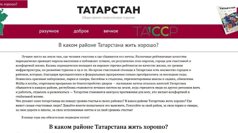 Что думают сами татарстанцы по поводу уровня счастья в своих районах? В каком районе Татарстана жить хорошо? Где живут самые счастливые люди? Давайте вместе попытаемся это выяснить. Голосуйте за свой район, за свои парки и скверы, за свои дороги и школы, за свои исполненные мечты и за свой уровень счастья!