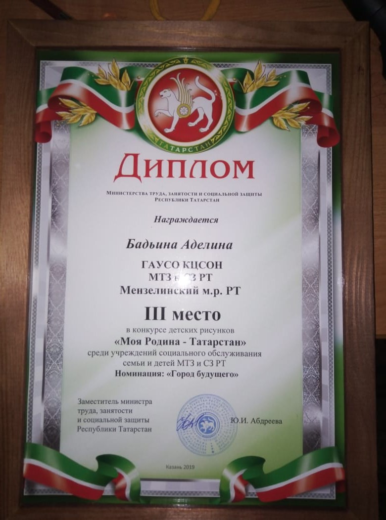 В ноябре 2019 года в рамках реализации плана мероприятий Министерства труда, занятости и социальной защиты Республики Татарстан по подготовке и проведению празднования 100-летия образования Татарской АССР проводился конкурс рисунков «Моя родина - Татарстан» среди детей, являющихся получателями социальных услуг в государственных учреждениях социального обслуживания Республики Татарстан, с целью развития творческих способностей детей и подростков и систематизации знаний о родном крае. В оргкомитет конкурса поступило 285 детских рисунков, из них 5 рисунков от ГАУСО «КЦСОН в Мензелинском муниципальном районе». По итогам конкурса Аделина Бадьина заняла 3 место в номинации «Город будущего».