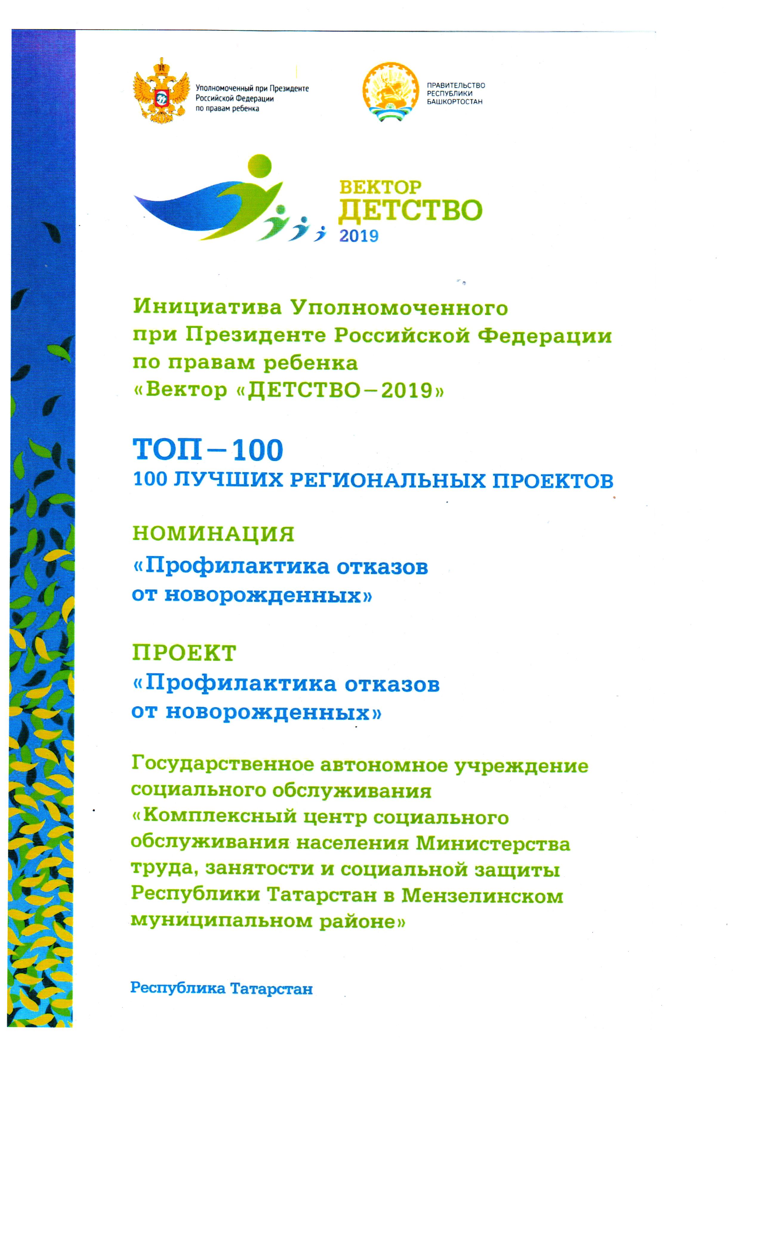 По итогам конкурсного отбора программа по профилактике раннего отказа матерей от новорожденных детей и повышение рождаемости «НОВАЯ ЖИЗНЬ – БУДУЩЕЕ НАДЕЖДЫ», разработанная психологами ГАУСО «Комплексный центр социального обслуживания населения Министерства труда, занятости и социальной защиты Республики Татарстан в Мензелинском муниципальном районе» отделения социальной помощи семье и детям, вошла в 100 лучших региональных проектов (ТОП-100) в номинации «Профилактика отказов от новорожденных». Цель данной программы - создание благоприятных условий для рождения и воспитания здоровых детей, профилактика отказов от новорожденных детей, пропаганда ценностей материнства.