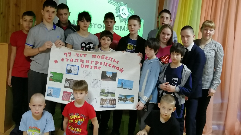 Есть в календаре такие даты, которые навечно вписаны в героическую летопись страны. Одна из них – Сталинградская битва. 3 февраля в РЦ «Умырзая» было проведено мероприятие «Мы этой памяти верны», посвященное 77-летию Сталинградской битвы. Основной целью мероприятия было формирование чувства патриотизма, гордости за свою страну на примере героических поступков. С воспитанниками была проведена беседа с использованием мультимедийной презентации, в ходе которой дети услышали истории о подвигах защитников Сталинграда, которые в дальнейшем изменили ход войны. Так же дети изучали военные памятники и мемориалы города Волгограда. Минутой молчания почтили память героев Сталинградской битвы. Завершилось мероприятие совместной творческой работой – созданием коллажа «Сталинградская битва».