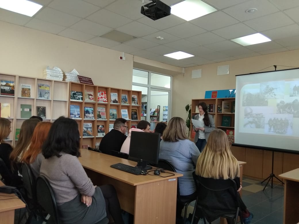 7 февраля, отдавая дань уважения тем, кто проявил высочайшую силу духа, героизм, выполняя боевой долг в Афганистане, библиотекарь центральной библиотеки Оля Гатиятова для студентов ГАПОУ "Мензелинский сельскохозяйственный техникум" провела час памяти "В жарком небе Афганистана". Ведущая мероприятия познакомила ребят с обычаями, традицией, природой и самобытной историей Афганистана. На мероприятии прозвучали стихи в исполнении студентов, посвященные событиям в Афганистане, отрывки из писем солдат. Час памяти сопровождался показом презентации "В жарком небе Афганистана". Была оформлена книжная выставка "Афганистан. Наша память и боль".