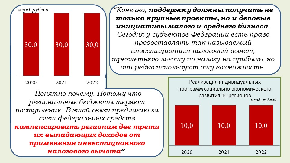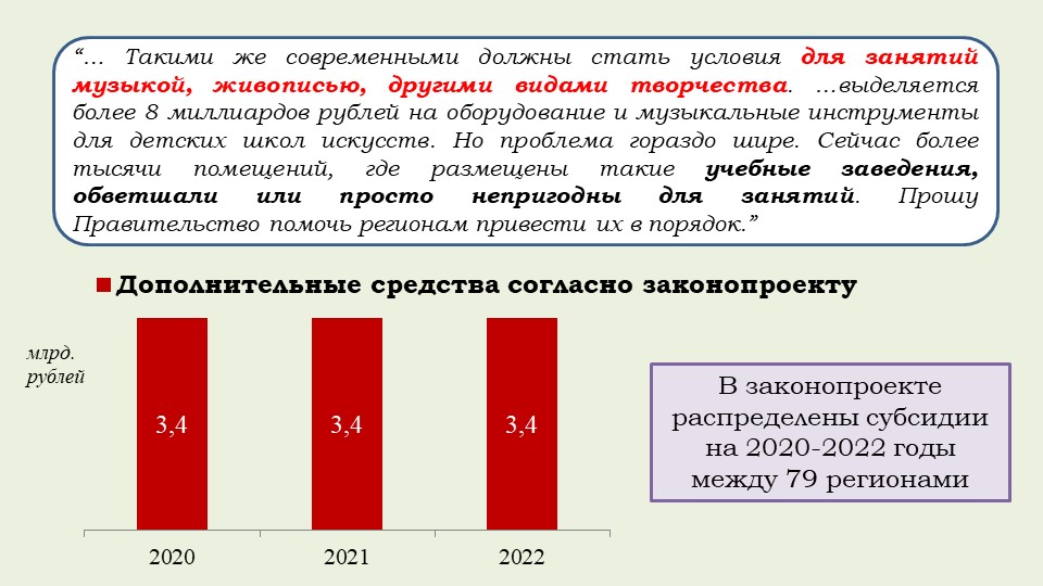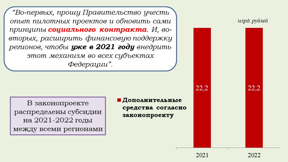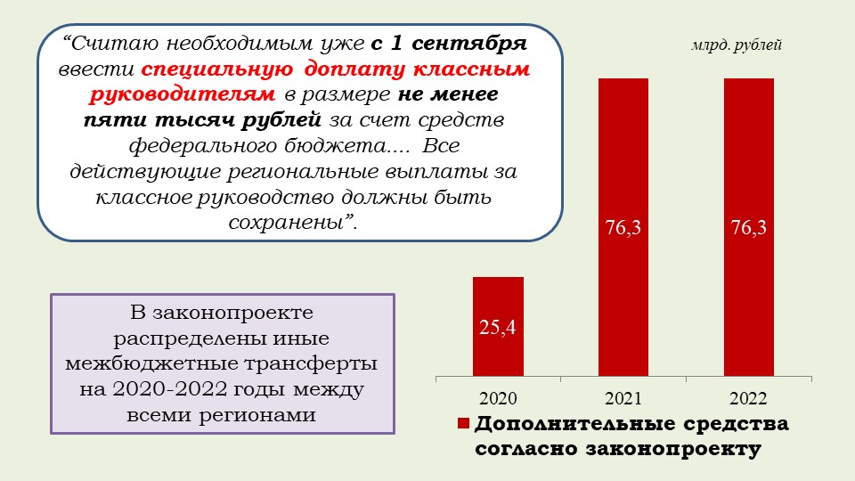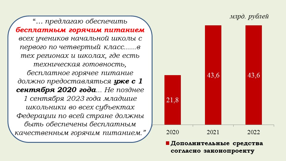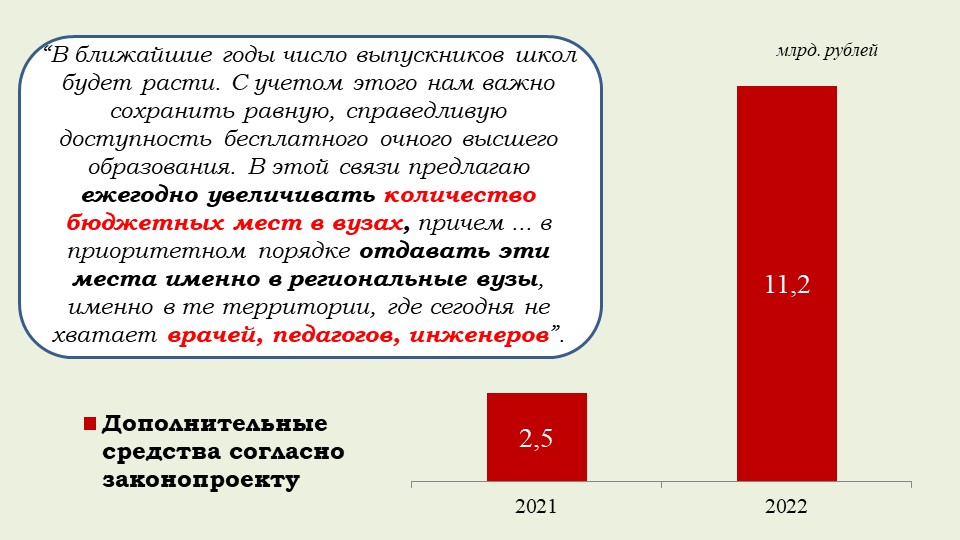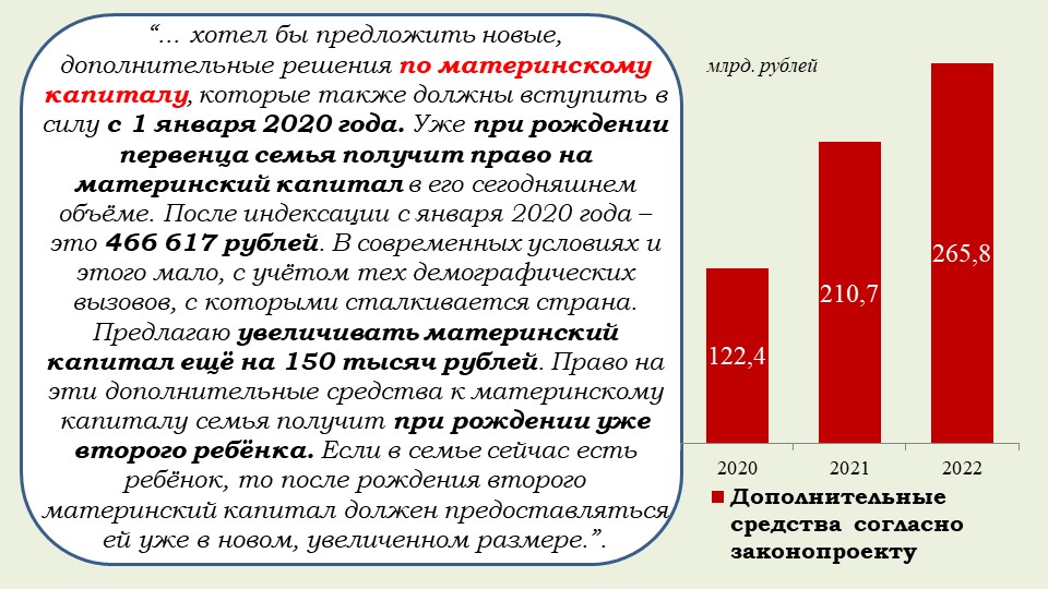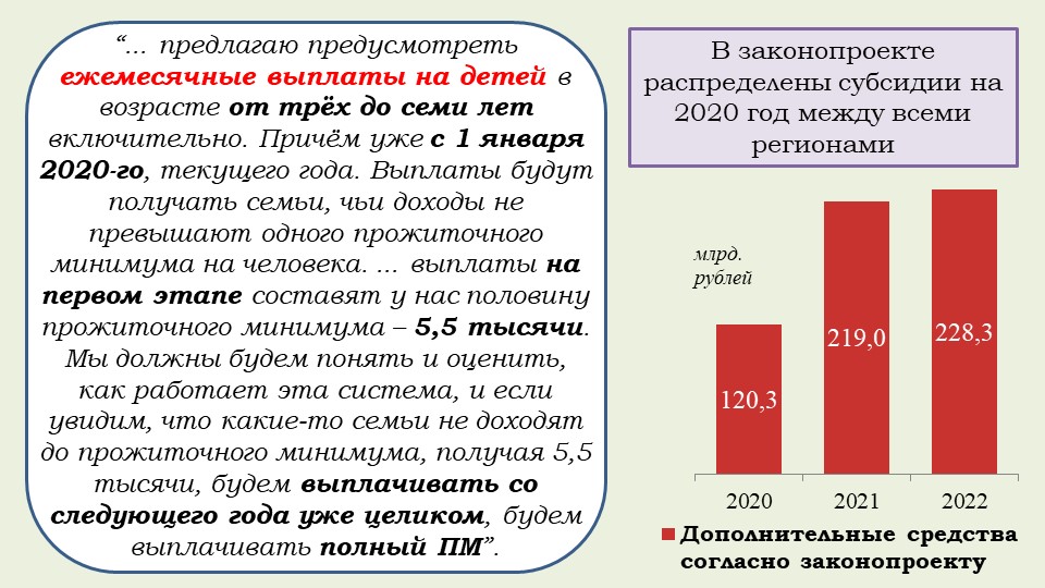 «Хотела бы обратить внимание на то, что этот закон обеспечивает финансовое обоснование Послания Президента и гарантию того, что все социальные обязательства государства будут выполнены. Это расширение программы маткапитала на семьи, где родился первый ребенок, увеличение выплаты при рождении второго ребенка, ежемесячные выплаты малоимущим семьям с детьми от 3 до 7 лет, обеспечение бесплатным горячим питанием в начальной школе, надбавка учителям за классное руководство, субсидия регионам на создание дополнительных мест в школах, модернизация первичного звена здравоохранения, оснащение школ искусств, увеличение числа бюджетных мест в вузах, компенсация регионам две трети выпадающих доходов от применения инвестиционного налогового вычета и другие общественно значимые меры».