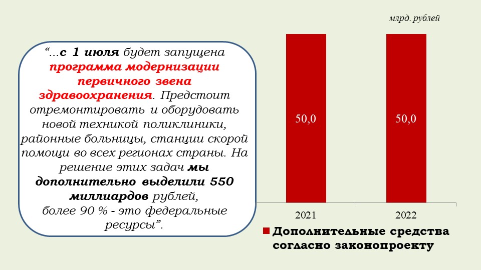 Общий объем дополнительных затрат на реализацию социальных инициатив Послания за три года оценивается в 2 трлн руб., из которых около 1,8 трлн рублей будут обеспечиваться федеральным бюджетом.