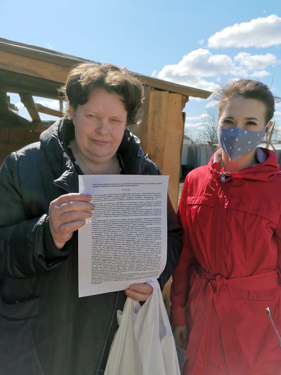 Психолог отделения социальной помощи семье и детям Светлана Соловьева раздала памятки «Рекомендации психолога по охране психического здоровья детей и подростков во время вспышки коронавируса», сотрудники малого предприятия по изготовлению детской мебели и товаров первой необходимости каждой семье вручили продуктовые подарочные наборы и многоразовые двусторонние маски.