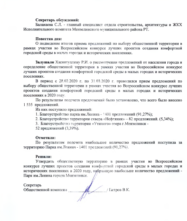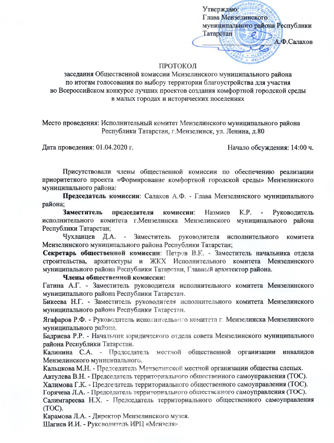 ПРОТОКОЛ заседания Общественной комиссии Мензелинского муниципального района по итогам голосования по выбору территории благоустройства для участия во Всероссийском конкурсе лучших проектов создания комфортной городской среды в малых городах и исторических поселениях