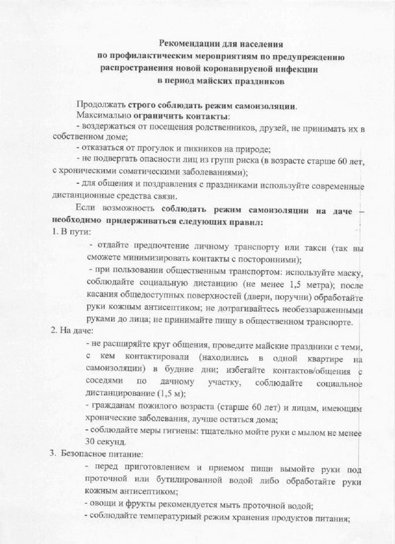 Рекомендации для населения по профилактическим мероприятиям по предупреждению распространения новой короновирусной инфекции в период майских праздников.