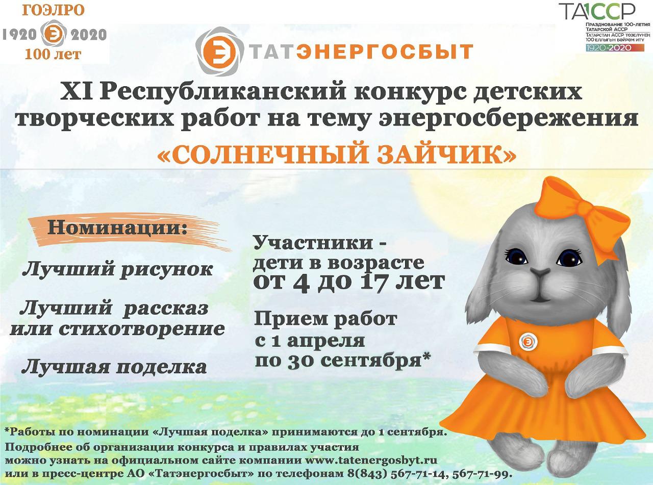 АО “Татэнергосбыт” продолжает прием заявок на XI Республиканский конкурс детских творческих работ на тему энергосбережения «Солнечный зайчик». Данный конкурс проводится с целью повышения интереса детей к проблеме бережного отношения к энергоресурсам, а также воспитания энергосберегающей модели поведения у подрастающего поколения.