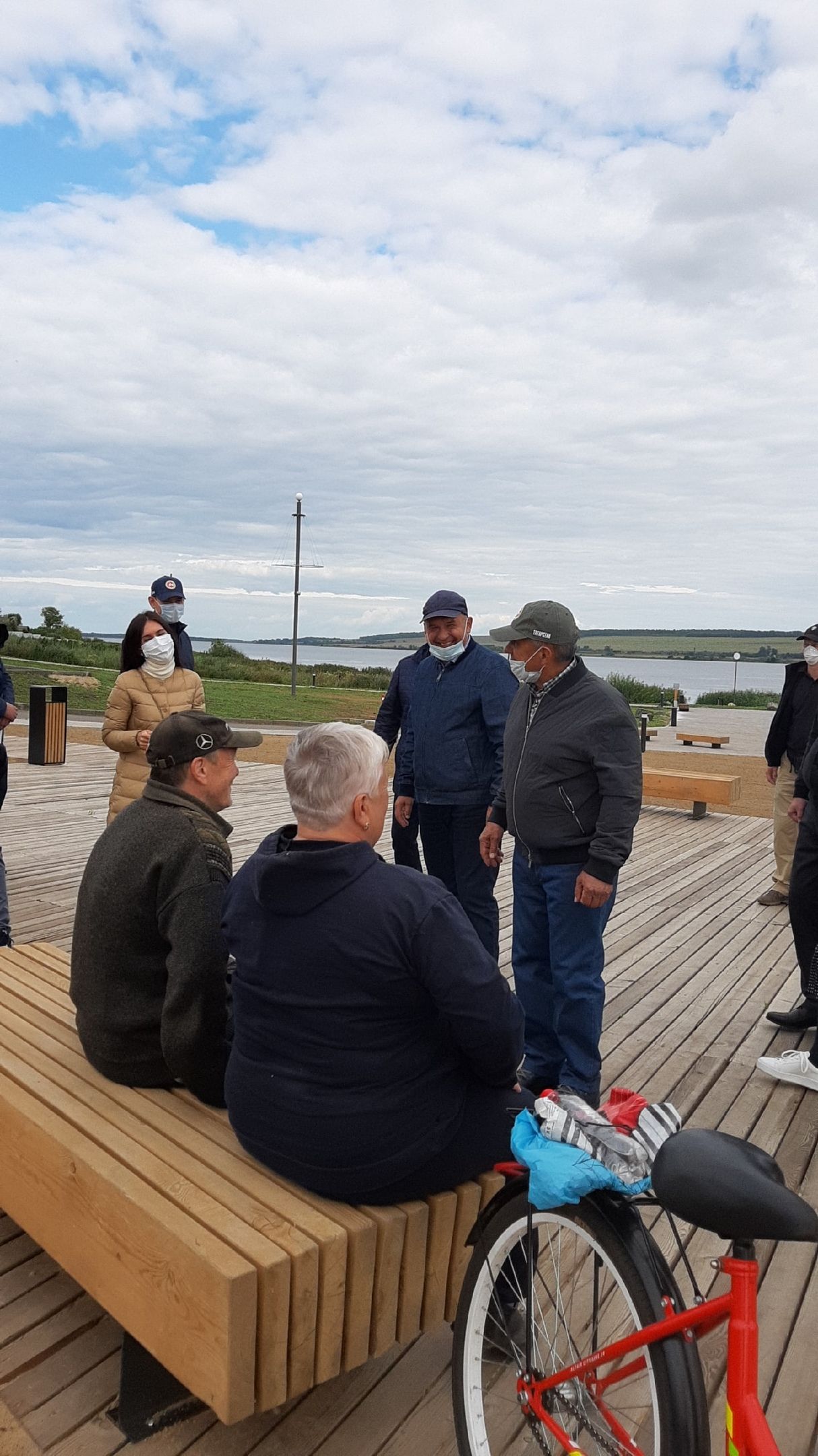 На берегу со стороны города он пообщался с местными жителями: спросил у детей как часто они приходят на набережную, узнал у пенсионеров как они проводят своё время тут (речь шла о рыбалке и хождением за грибами), посмотрел, как молодые люди занимаются на новых тренажёрах.