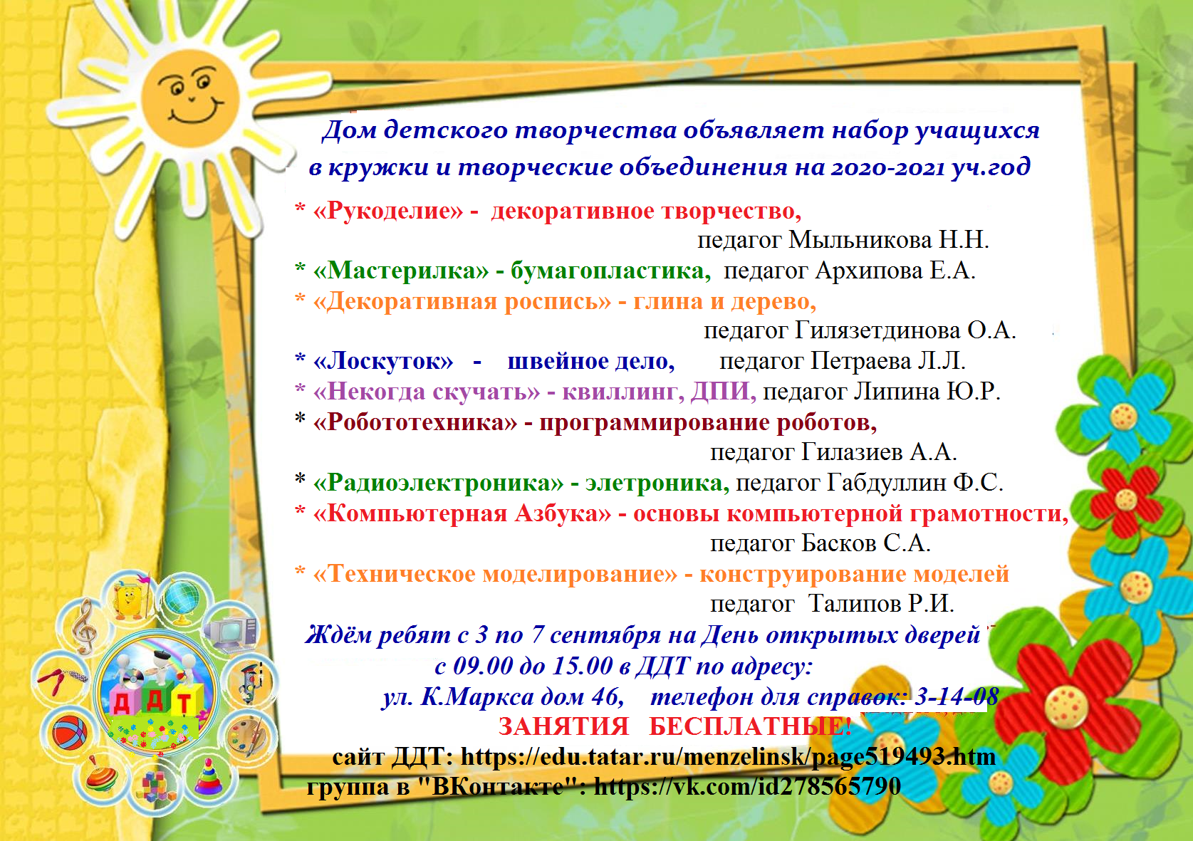 И по замечательной традиции ДДТ широко распахнёт свои двери для всех желающих в Дни открытых дверей с 3 по 7 сентября. С 09.00 до 15.00 все желающие могут познакомиться с работой кружков и секций, пообщаться с педагогами, записаться в понравившийся кружок.