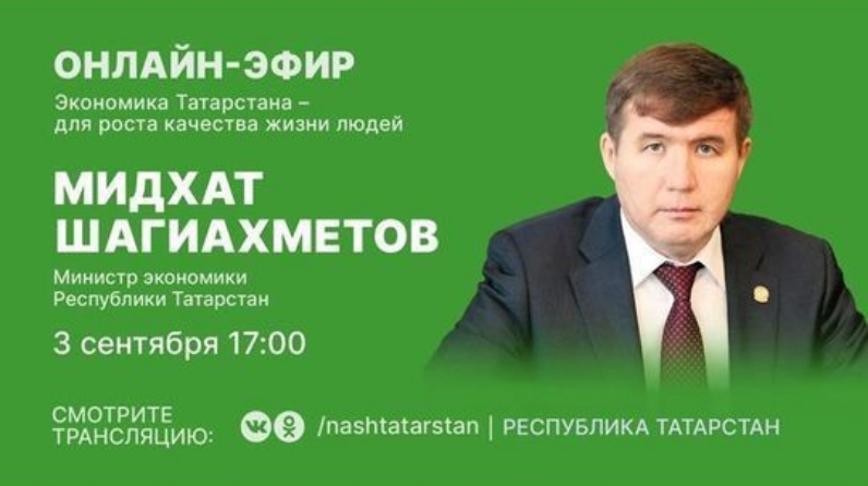 Сегодня, 3 сентября, в 17:00 в прямом эфире программы #ТатарстанОнлайн министр экономики РТ Мидхат Шагиахметов расскажет о том, как развивается экономика Татарстана и какие меры поддержки оказывают предпринимателям республики.