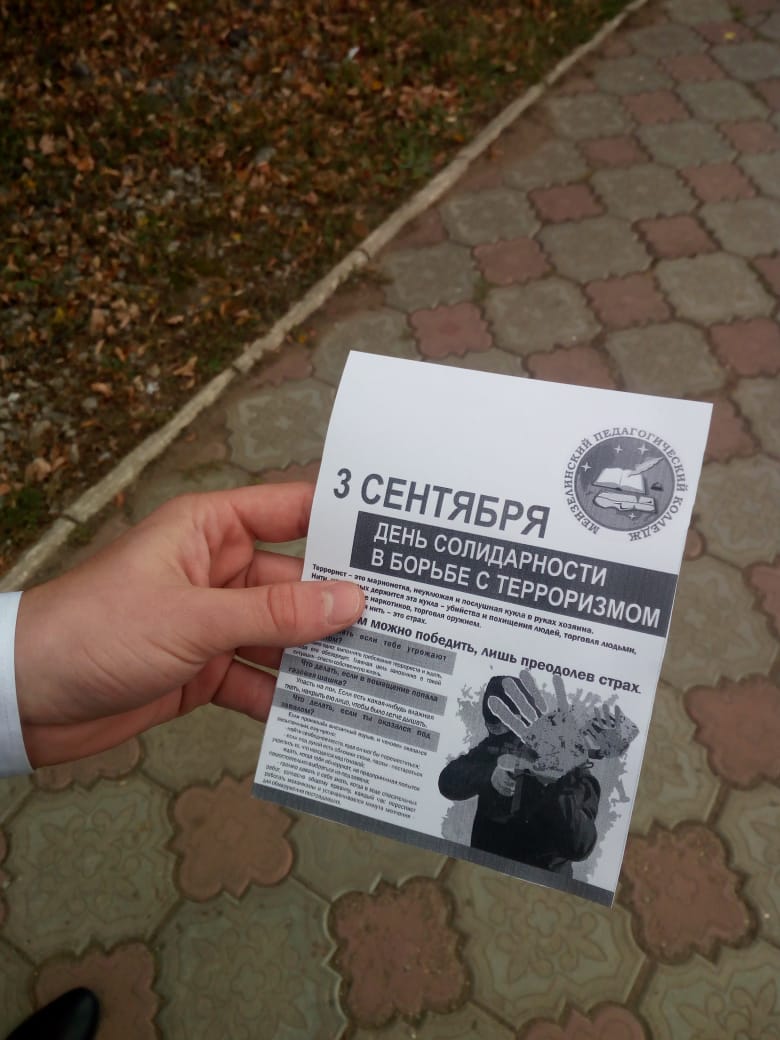 Сегодня, 3 сентября, волонтеры колледжа провели акцию, посвященную этой трагической дате. Они раздавали листовки обучающимся колледжа и жителям города с инструкциями выживания при захвате террористами.