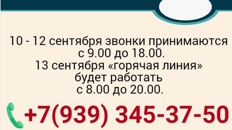 Звонки принимаются ежедневно (с 10 по 12 сентября) с 09:00 до 18:00.