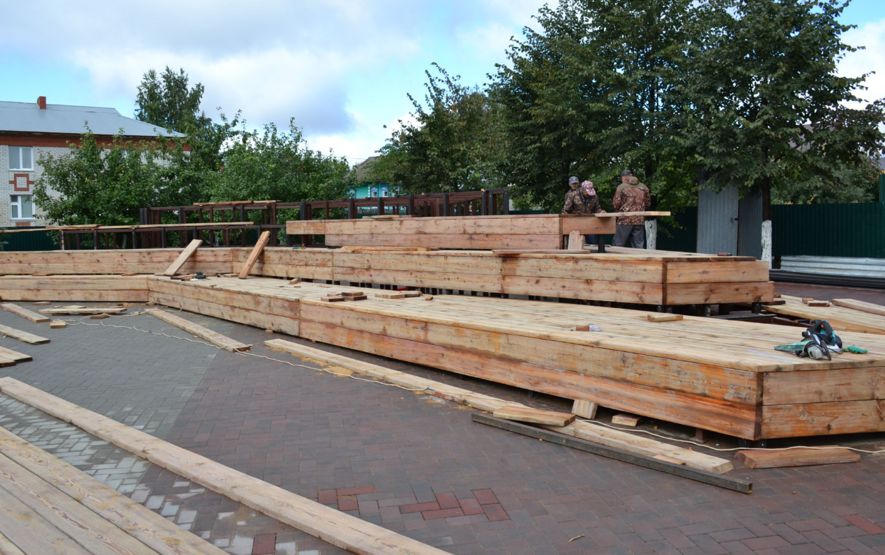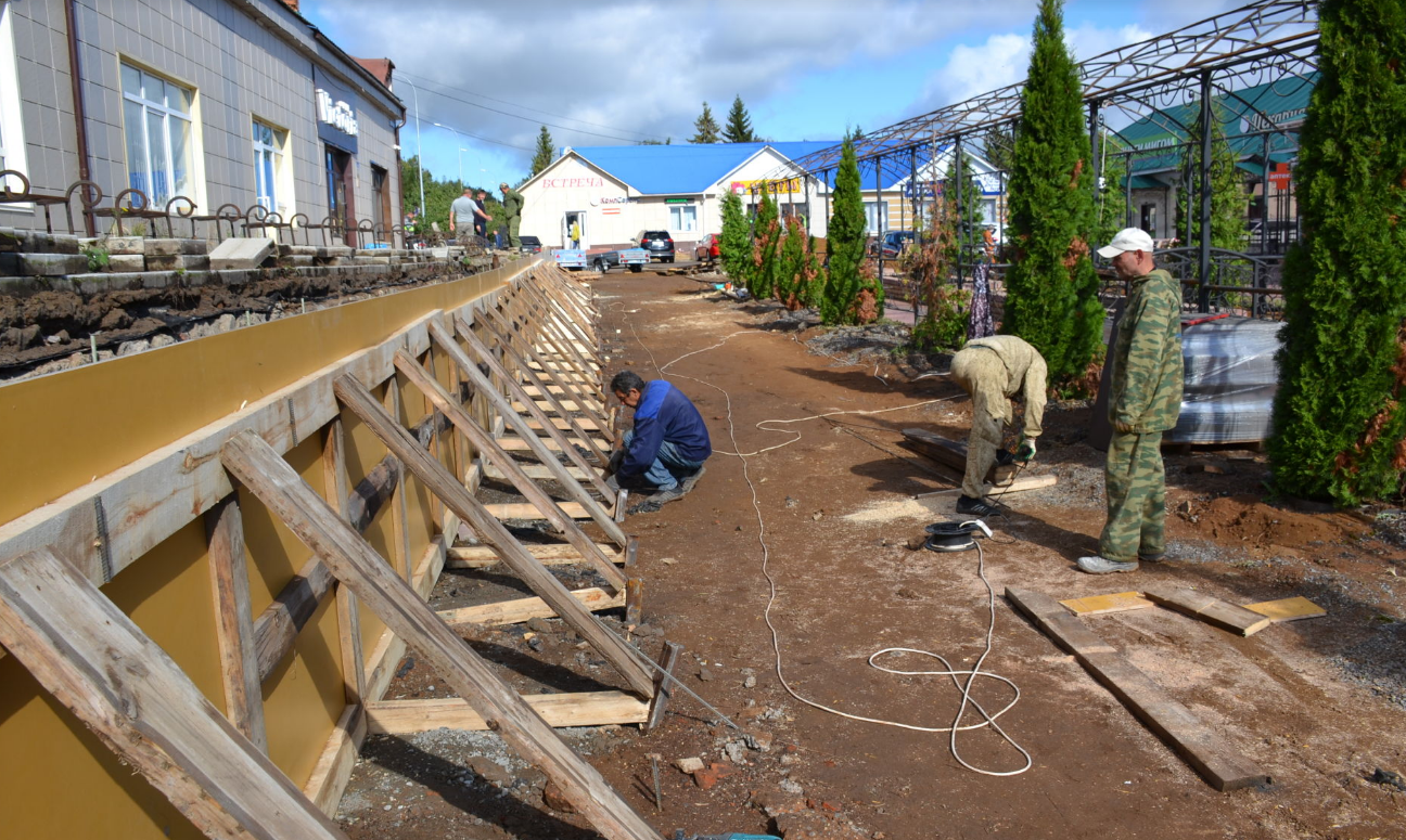 В сквере “Школьный” на масштабных работах по ремонту и благоустройству трудятся 14 человек, из брусчатки уложили тротуар, установили бордюры для укладки тропинок.