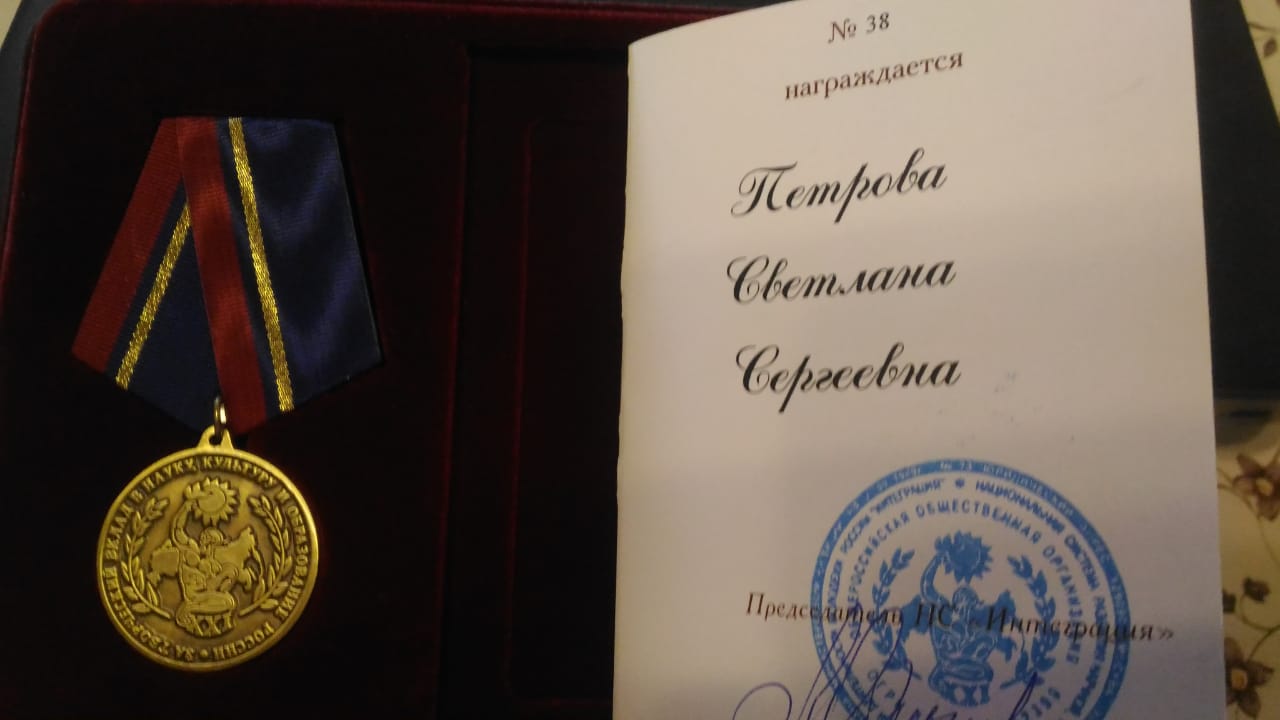 Учителю технологии МБОУ "СОШ N2", Светлане Петровой была вручена медаль "За творческий вклад в науку, культуру и образование России".