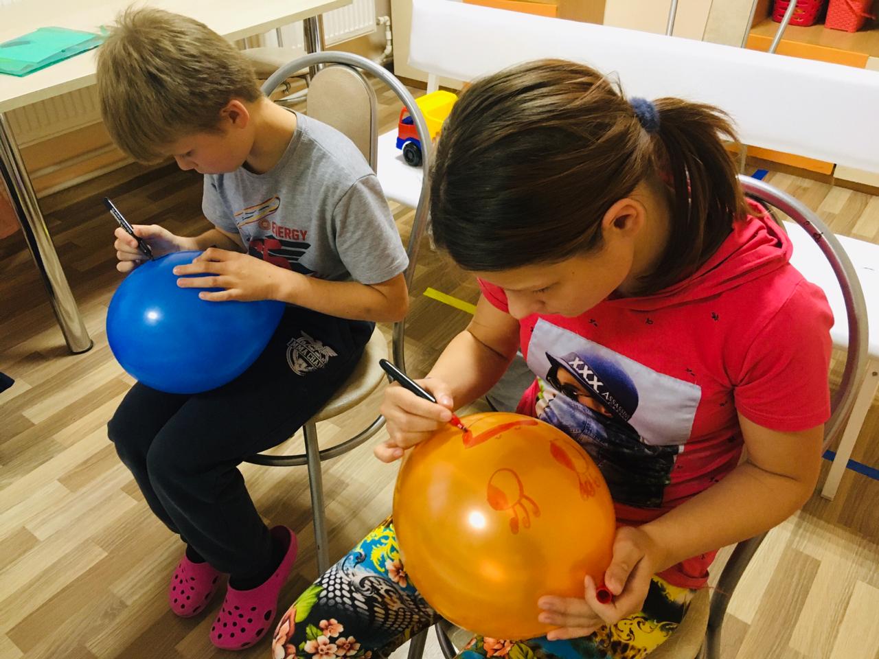 После просмотра презентации детям было предложено подумать, на чем можно рисовать, кроме бумаги. «На доске, на асфальте, - звучали ответы. Алина Дмитриевна предложила порисовать на шариках и ребятам эта идея очень понравилась.
