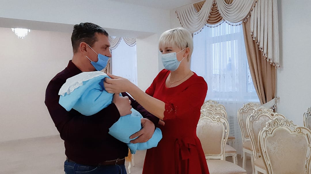 Маленький Захар вместе с родителями принимал поздравления от заместителя руководителя Исполнительного комитета района по социальным вопросами Нэли Бикеевой и начальника отдела ЗАГС Анны Куприяновой.