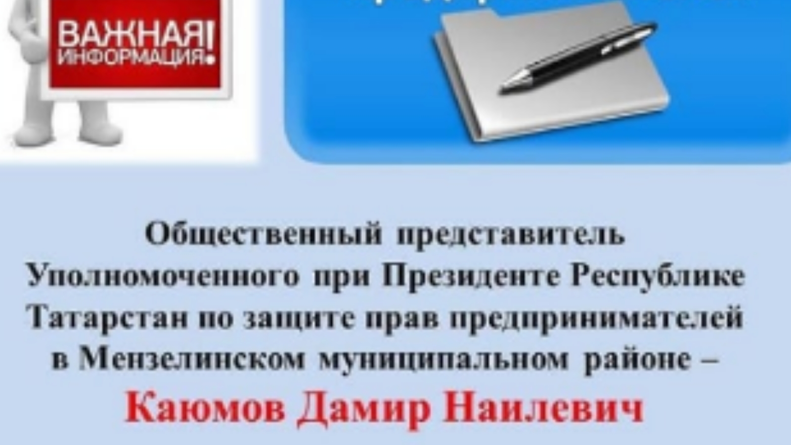 Общественный представитель Уполномоченного при Президенте РТ по защите прав предпринимателей в Мензелинском районе назначен Каюмов Дамир Наилевич.