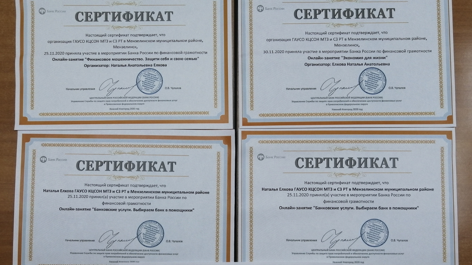Достойным завершением обучения было прохождение Всероссийского онлайн - зачета по финансовой грамотности, проходившим с 07-16.12.2020г. Сотрудники комплексного центра оценили уровень своих финансовых знаний, ответив на 30 вопросов о вкладах, кредитах, страховании и на другие актуальные темы. Приняли участие в проекте, успешно прошли тест, все участники получили именные сертификаты.