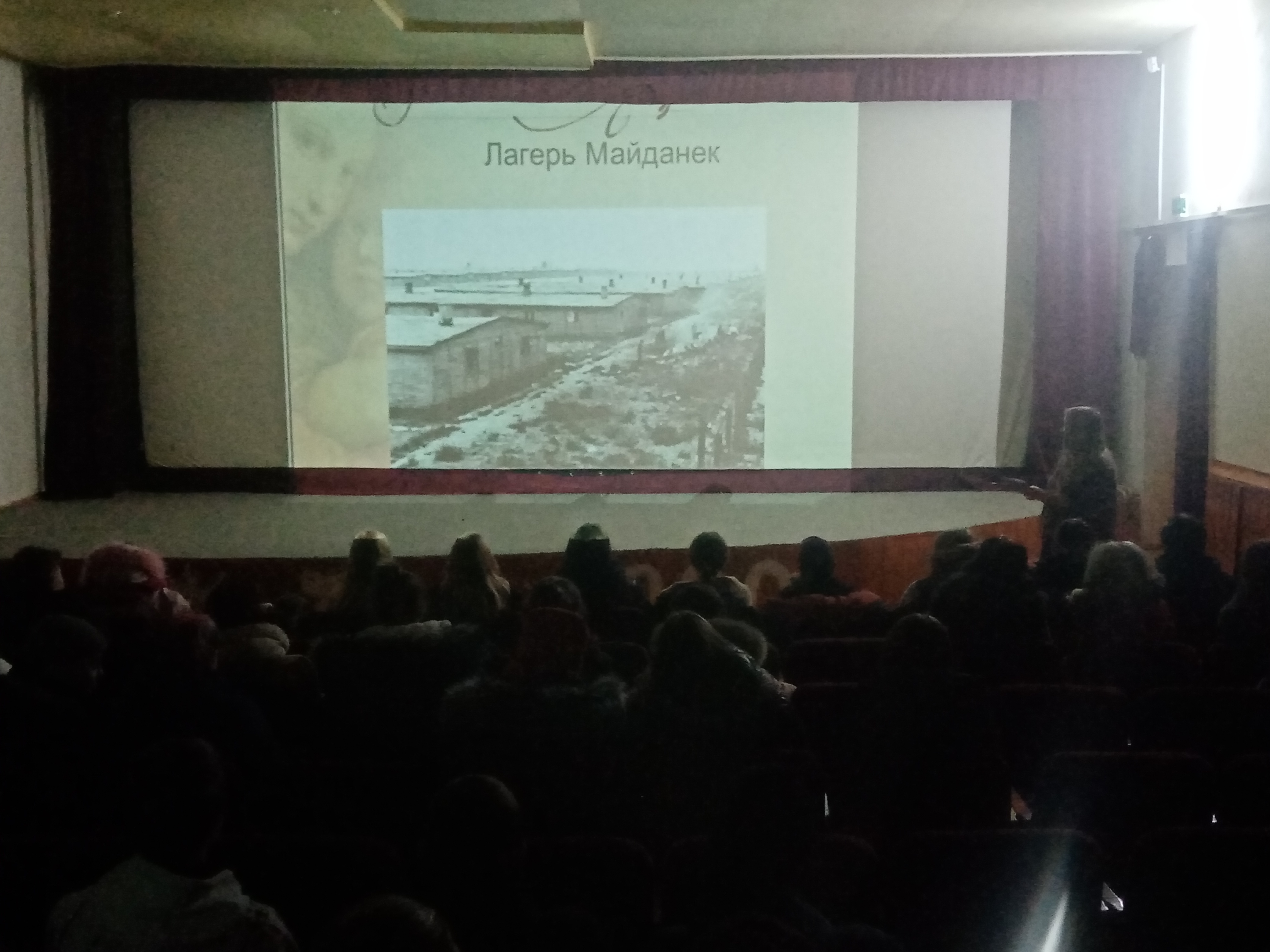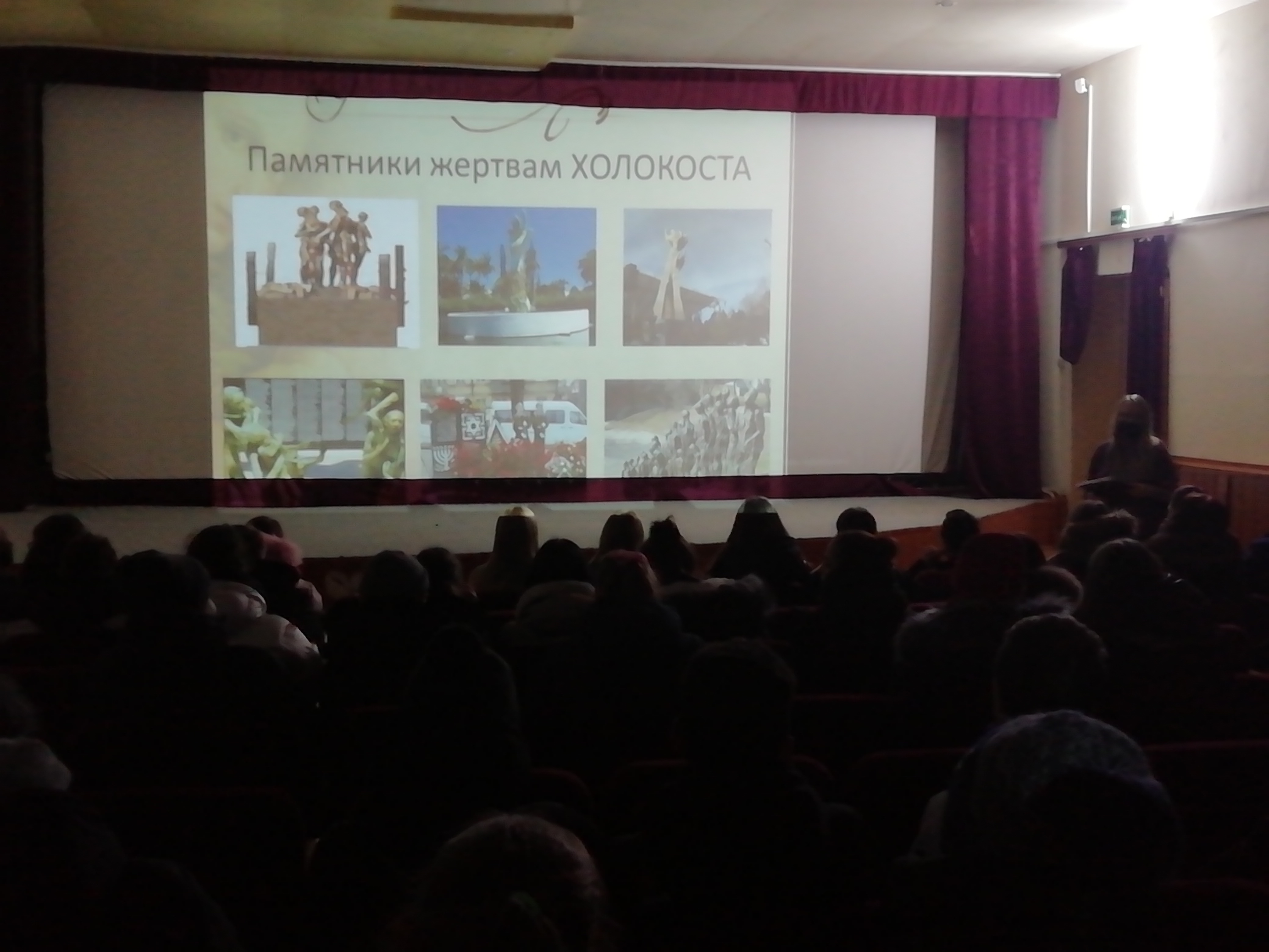 К Международному дню Холокоста было проведено мероприятие с приглашением учащихся СОШ №2. Киномероприятия включала в себя беседу о лагерях смерти, с показом презентации, и художественного фильма «Собибор».