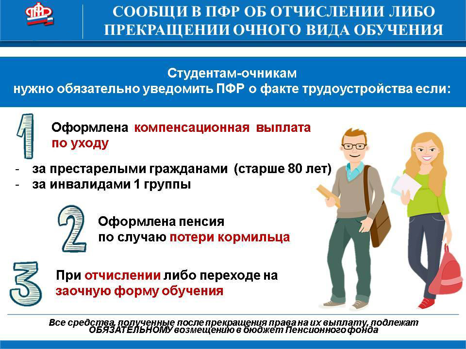 Факт трудоустройства - решающий и при оформлении компенсационной выплаты по уходу за престарелыми (старше 80 лет), инвалидами I группы или детьми-инвалидами. Получать такую выплату могут только неработающие. При этом нередки случаи, когда студент оформил выплату по уходу за своей бабушкой, а во время летних каникул устроился официально на работу и забыл уведомить ПФР об этом. Полученные после трудоустройства денежные средства являются переплатой и подлежат обязательному полному возмещению.