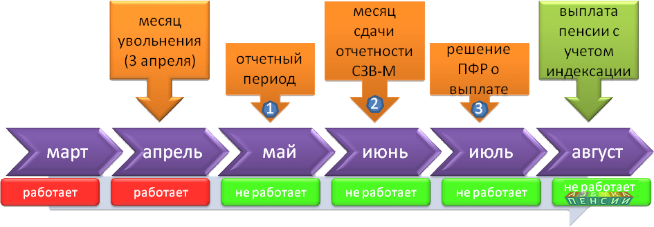 ПРИМЕР: гражданин увольняется в январе 2021 года. В феврале в ПФР поступит отчетность от работодателя с указанием того, что он еще работал в январе. В марте поступит отчетность, где гражданин работающим уже не числится. В апреле ПФР примет решение о выплате пенсии с учетом индексации. И в мае гражданин получит полный размер пенсии и денежную разницу между прежним и новым размером пенсии за февраль, март, апрель. То есть полный размер пенсии пенсионер начнет получать спустя 3 месяца после увольнения, но они будут компенсированы.