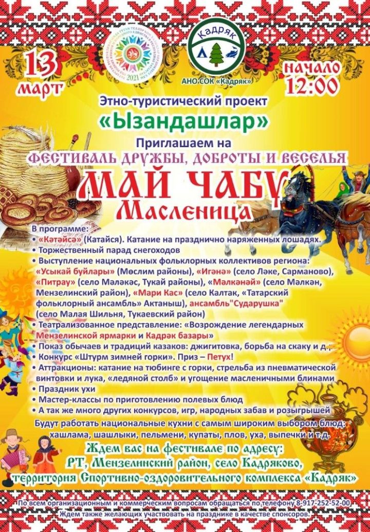 (Мензелинск, Ильшат Вагизов, “Мензеля-информ”) В спортивно-оздоровительном комплексе “Кадряк”, расположенном в Кадряковском сельском поселении Мензелинского района, этно-туристическим проектом “Ызандашлар” будет проведет фестиваль дружбы, добра и веселья “Масленица”. Начало праздника 13 марта в 12.00.
